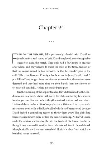 after school and they needed to make the most of the time, he’d say, or that the course would be too crowded, or that he couldn’t play in the cold. When the Broward County schools let out in June, David couldn’t put Billy off any longer. Summer afternoons were hot, the courses were deserted and they had more time on their hands than any sixteen or 67-year-old could fill. He had no choice but to play. On the morning of the appointed day, David descended to the condominium basement, where he’d stored his clubs on the day he’d moved in nine years earlier, and where they’d remained, untouched, ever since. He found them under a pile of empty boxes, a 400-watt hair dryer and a microwave oven with a dial knob, all of which had been stored because David lacked a compelling reason to throw them away. The clubs had been retained under more or less the same reasoning. As David tossed aside the ancient cartons to liberate the tools of his former trade, he thought how unusual it must be for an abandoned item to be reclaimed. Metaphorically, the basement resembled Florida: a place from which the banished never returned. 253
