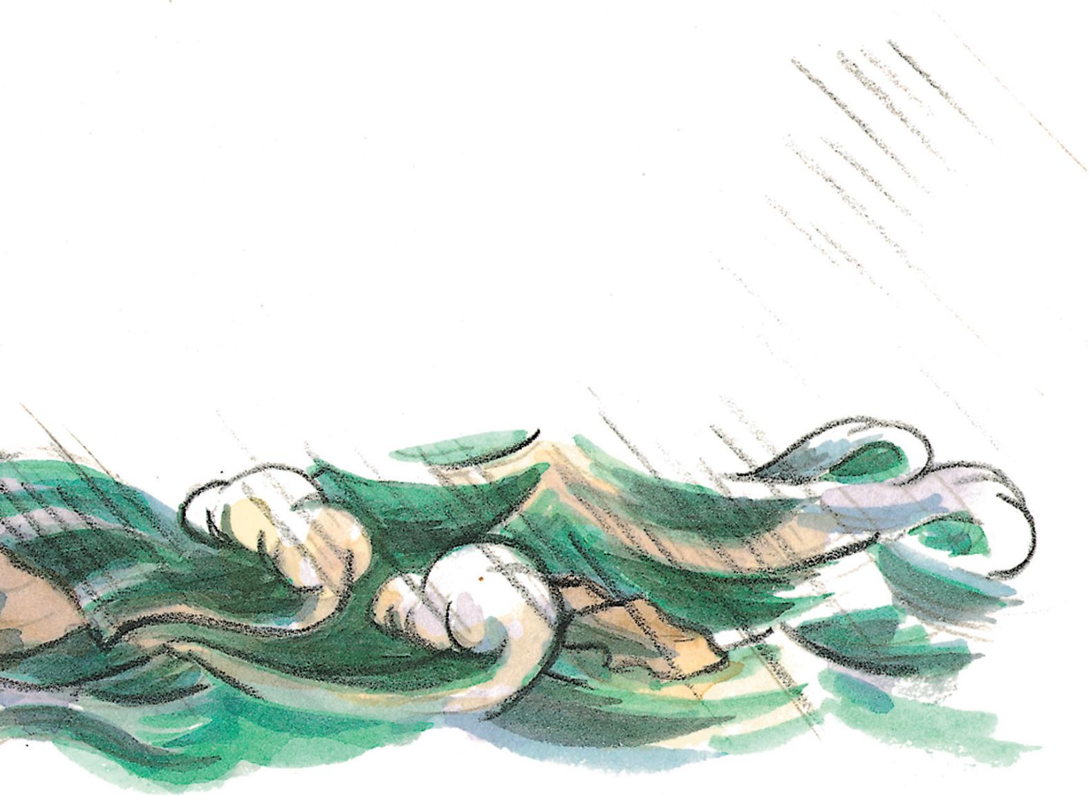 "Si bungsu pun kelaparan. Dia pergi kepada seorang petani untuk bekerja sehingga dia bisa makan. Petani itu membawanya ke ladang untuk menjaga ternak babi. la hanya bisa memakan sisa makanan babi itu."