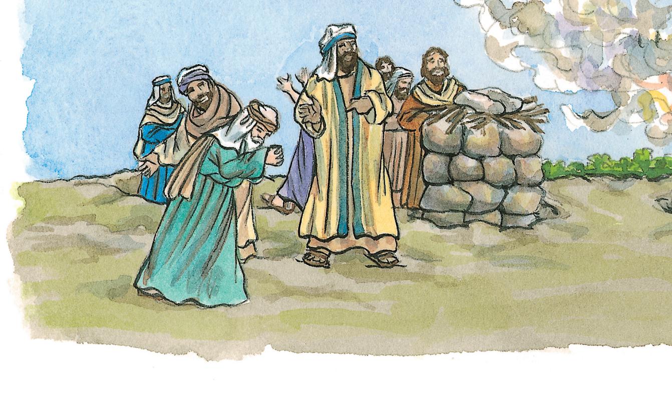 Kemudian api Allah turun dari sorga dan membakar daging, kayu dan batu altar. Api juga mengeringkan air dalam parit.