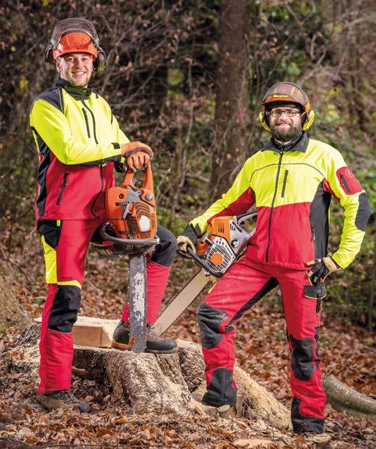 Das Sortiment umfasst ein vollständiges Set: verschiedene Hosen der Schnittschutzklasse 1, kurz- und langärmelige Shirts sowie robuste Jacken.