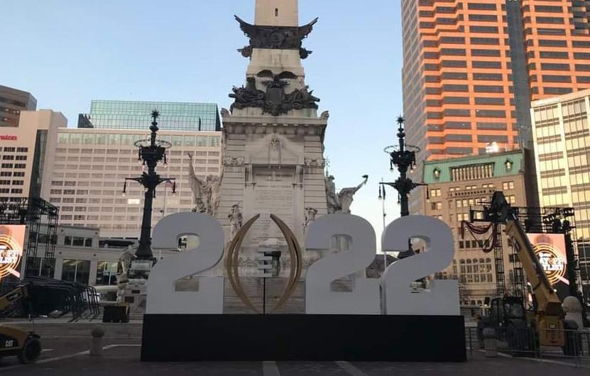 Club members attend NCAA College Football Championship in In dianapolis, Indiana. Picture taken in front of the 2022 logo at Monu ment Circle by Hannah Possinger.