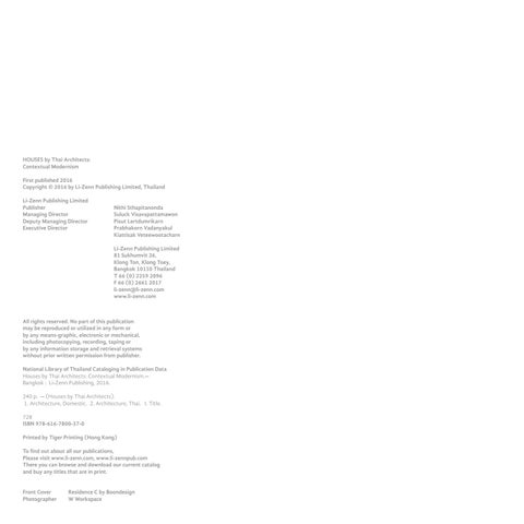 All rights reserved. No part of this publication may be reproduced or utilized in any form or by any means-graphic, electronic or mechanical, including photocopying, recording, taping or by any information storage and retrieval systems without prior written permission from publisher. National Library of Thailand Cataloging in Publication Data Houses by Thai Architects: Contextual Modernism.-- Bangkok : Li-Zenn Publishing, 2016. 240 p. -- (Houses by Thai Architects). 1. Architecture, Domestic. 2. Architecture, Thai. I. Title. 728 ISBN 978-616-7800-37-0 Printed by Tiger Printing (Hong Kong) To find out about all our publications, Please visit www.li-zenn.com, www.li-zennpub.com There you can browse and download our current catalog and buy any titles that are in print. Front Cover Photographer