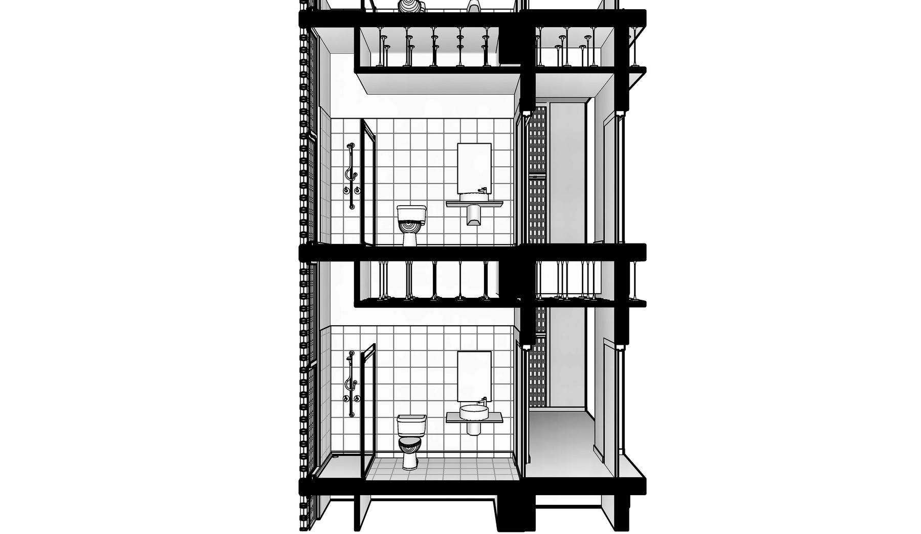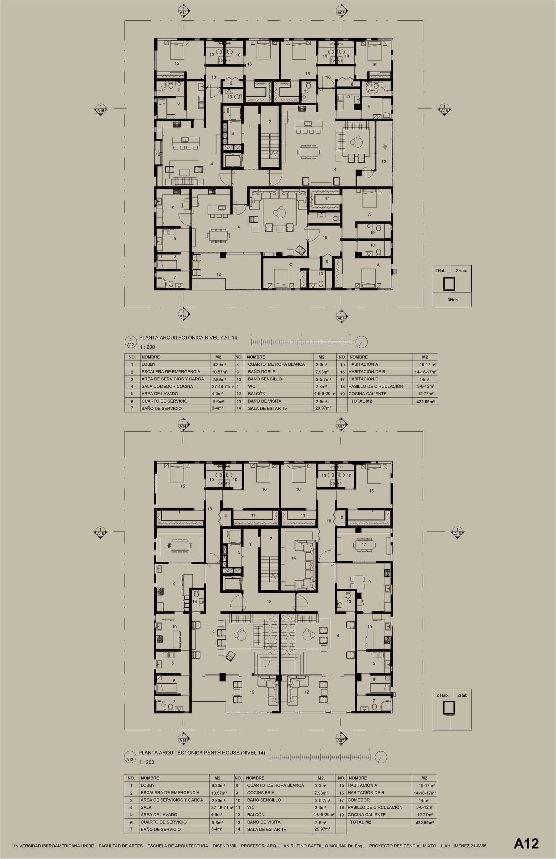 La distribución espacial es simple y en el nivel de apartamento se divide en tres apartamentos diferentes, divididos en dos de dos Hab y uno de tres Hab Incluye el área pública, como son los ascensores y los ductos de servicio y las escaleras de emergencia