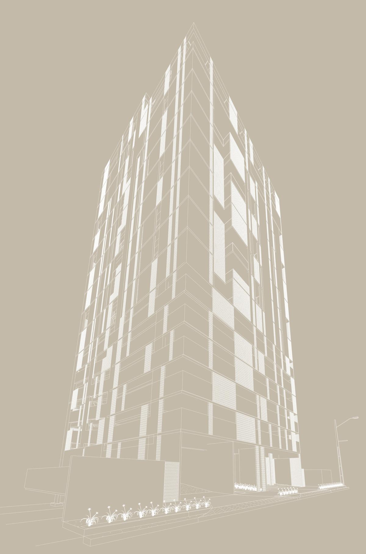 El emplazamiento ha sido diseñado de manera que la fachada siga una línea continua hasta el nivel del suelo Esta disposición permite que la apariencia del edificio se conecte visualmente con los peatones, invitando al público a visitar el área comercial y el bistró en el primer nivel del proyecto.