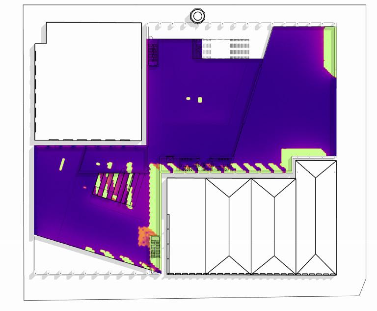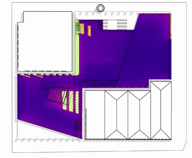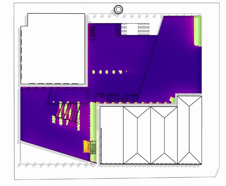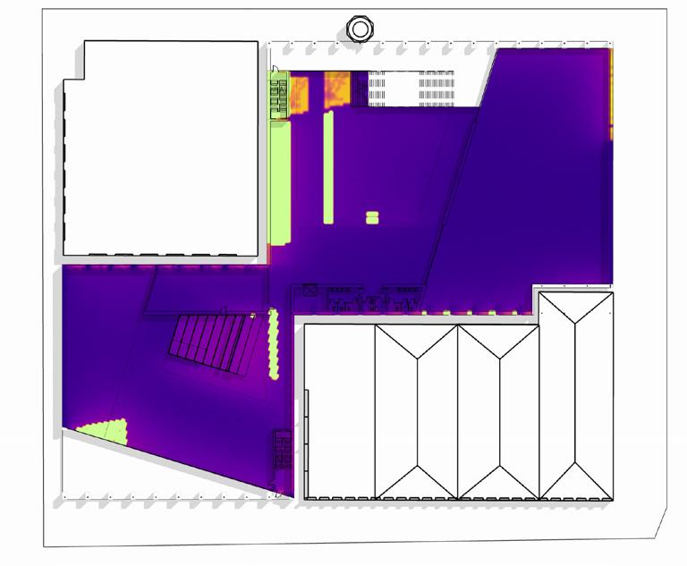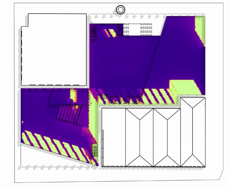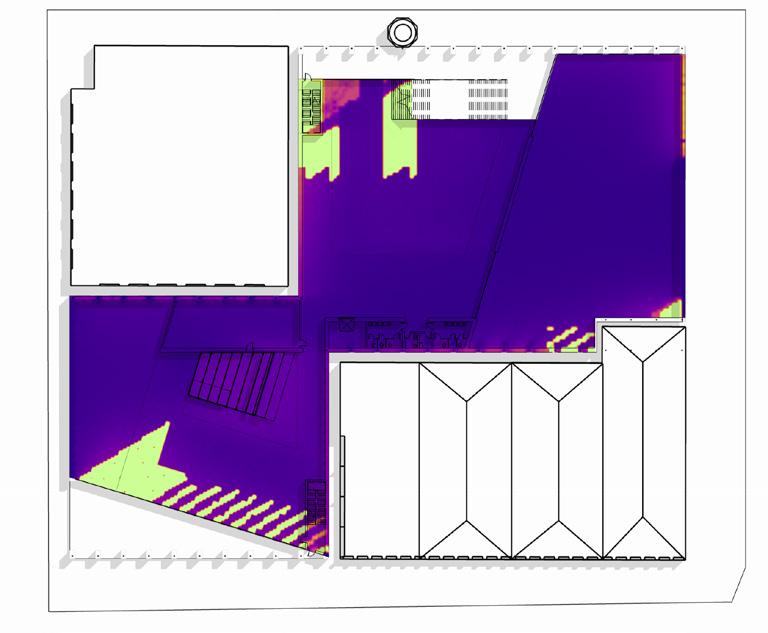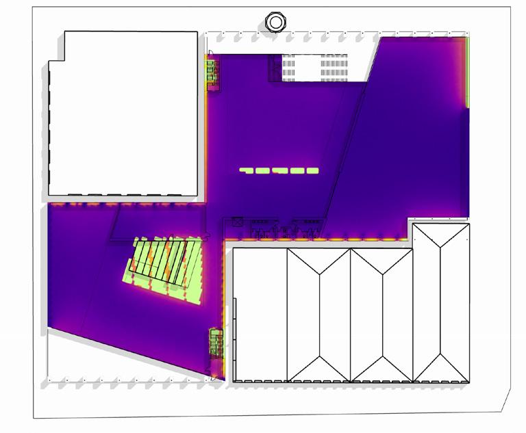 The daylight analysis of the two atriums reveals that the skylights effectively provide ample daylight, reducing artificial lighting needs. However, the south atrium risks overexposure near the summer solstice, potentially causing excessive heat gain and discomfort during presentations or lectures on the discovery stair. A few solutions could be: