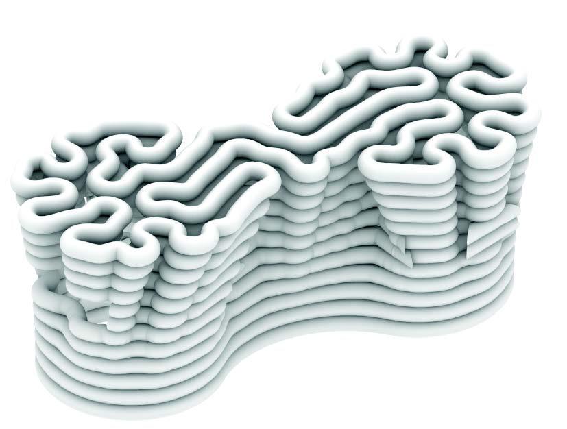 To achieve this, we created a growth curve algorithm within Grasshopper for Rhino This algorithm generates a continuous curve within predefined boundaries optimized for both ergonomic seating and site integration Instead of extruding the curve vertically, the vertical expression of the bench is a gradient, with its base representing the boundary and its apex representing the final form of the bench.