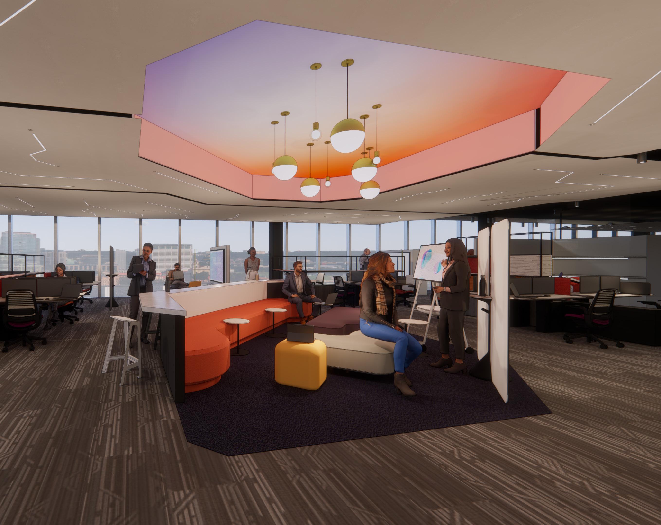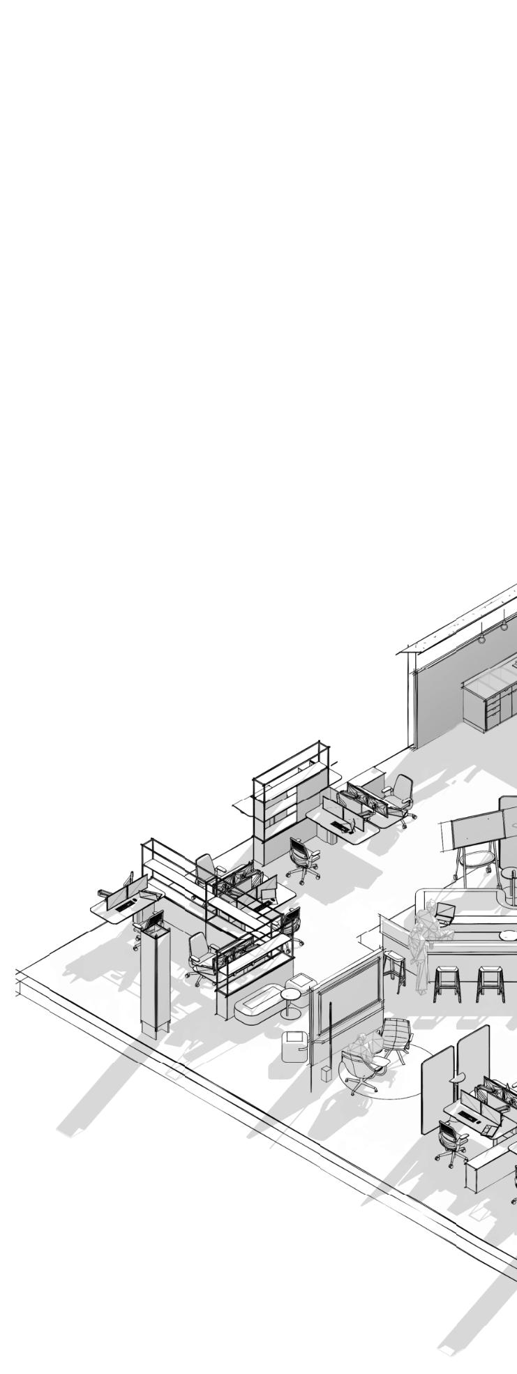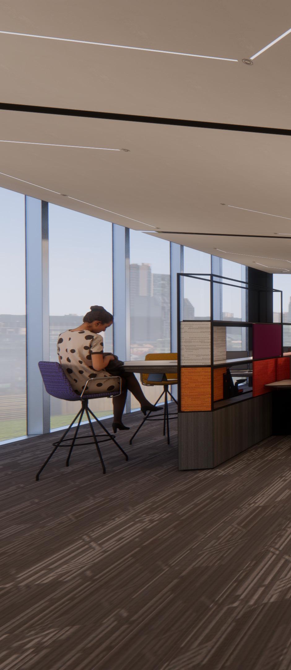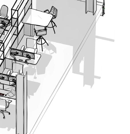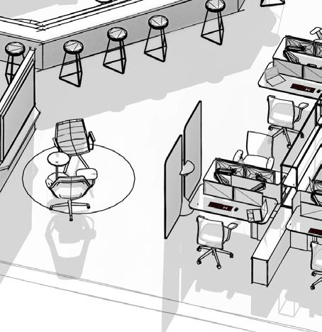 function, references to robotic behavior via occupancy sensors to contribute to reducing carbon footprint, and lastly shared sustainable materiality. By considering and developing multiple levels of the pathways and what they do, these can be used to welcome NEXT teammates to be included and interactive in the office regardless of their geographic location. NEXT strives to express appreciation and to provide sense of belonging, pride, and ownership to each of the teammates along with a need for their skills and specialties.