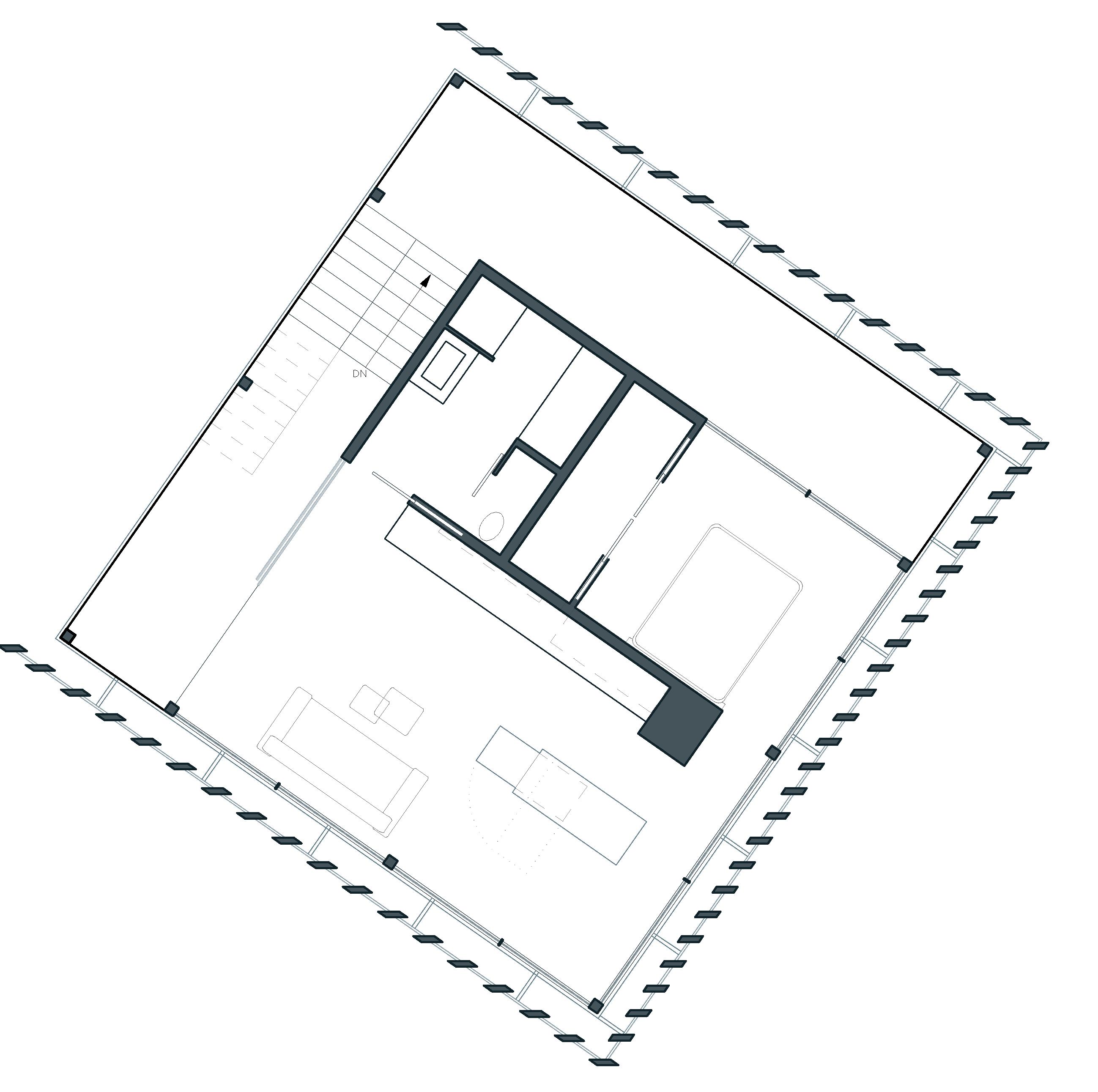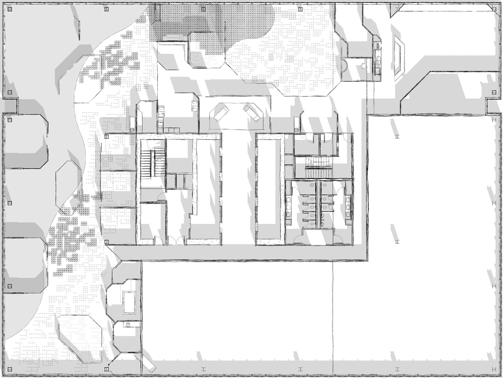 The design, inspired by the harmony of navigating storms, prioritizes functionality, flexibility, and sustainability to create a space that adapts and endures. Organized by a modular grid system, the mass timber structure allows for scalability as the organization grows. The roof features a thin shell membrane which captures rainwater, feeding hydroponic gardens along the south and west facades. These gardens provide food, filter sunlight, and introduce biophilia into the workspace, embodying West Street Recovery’s core
