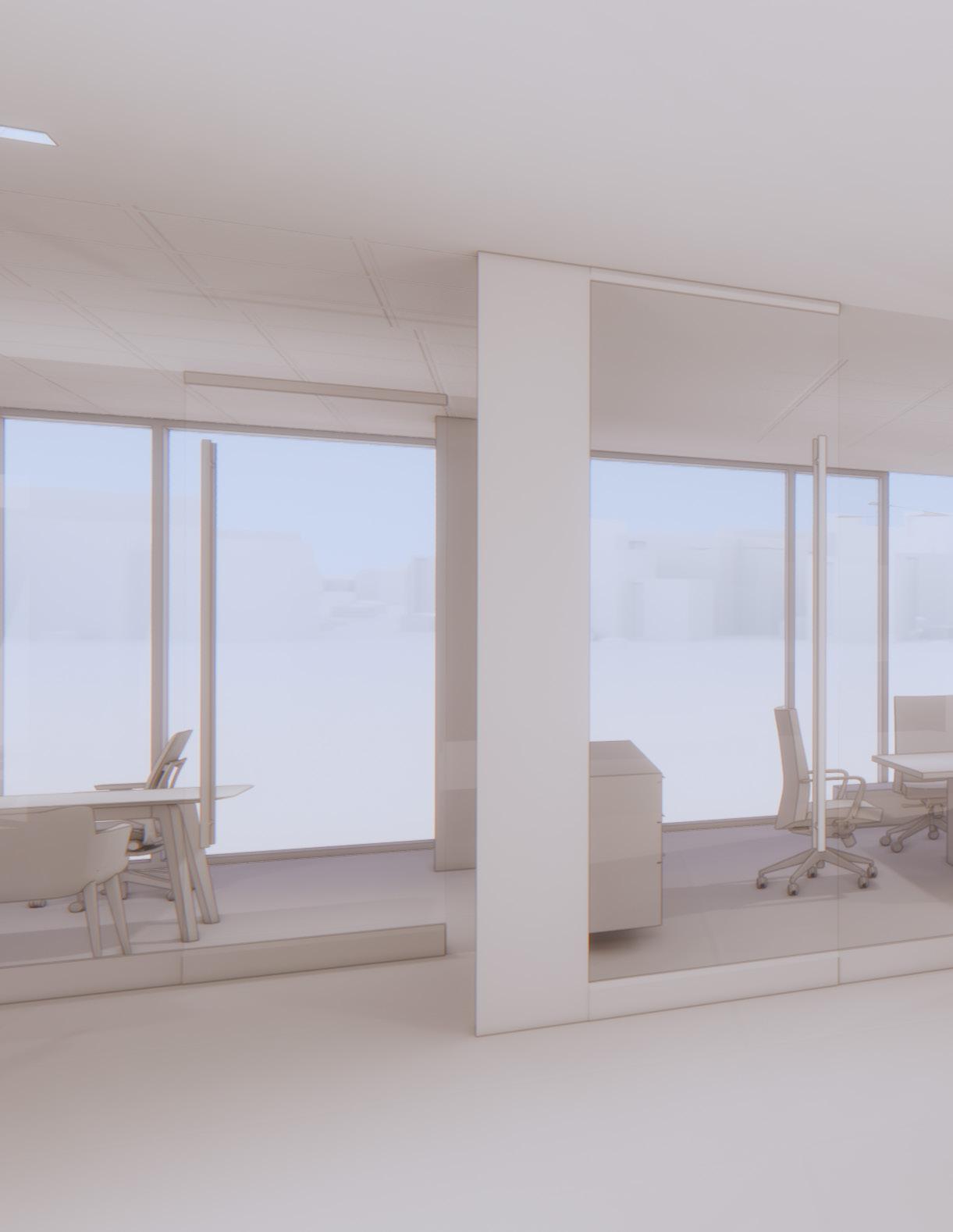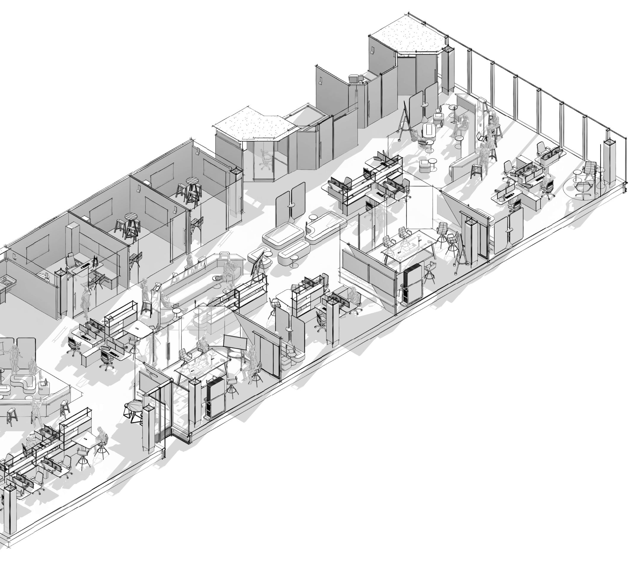 Right: Northwest Axonometric (Featuring: Three Team Zones, Two Enclosed Collaboration, Three Executive Suites)