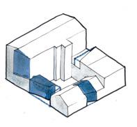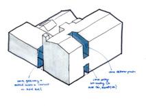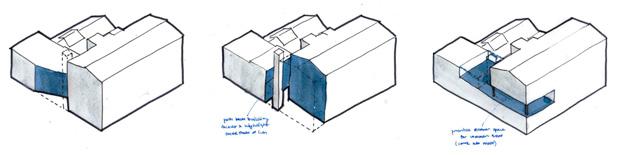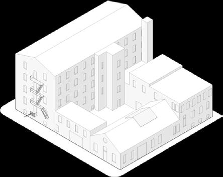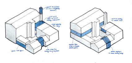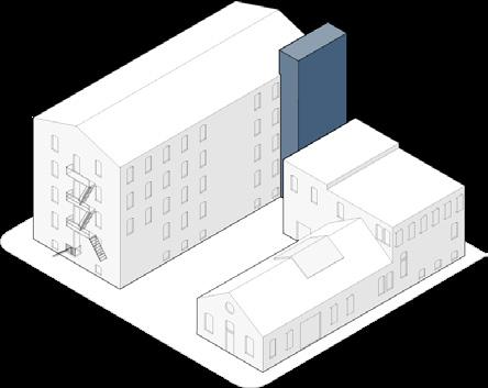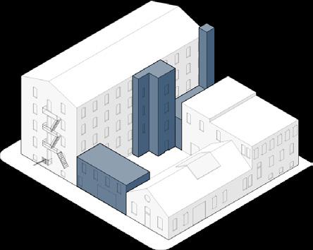 front building and link removed to open site and smoke stack adapted for stair tower