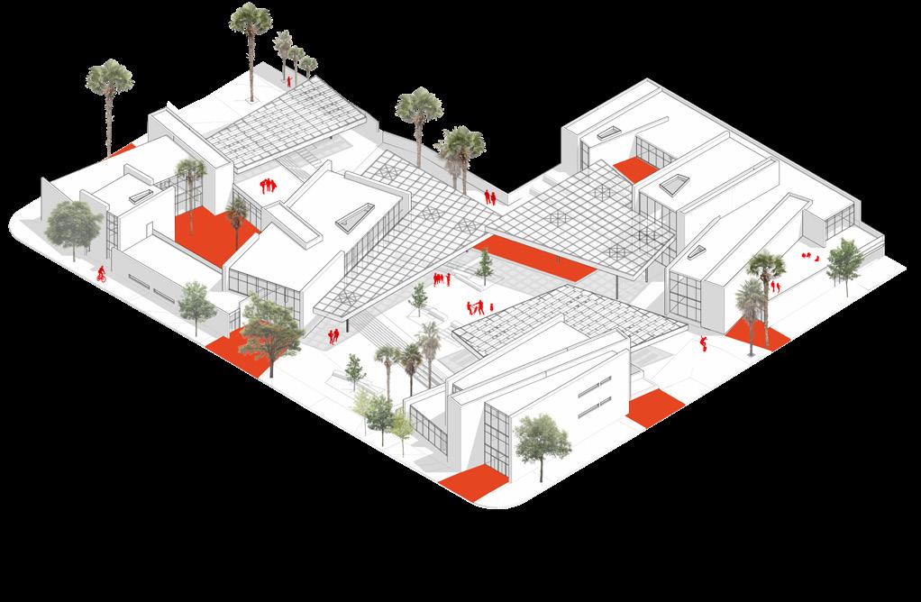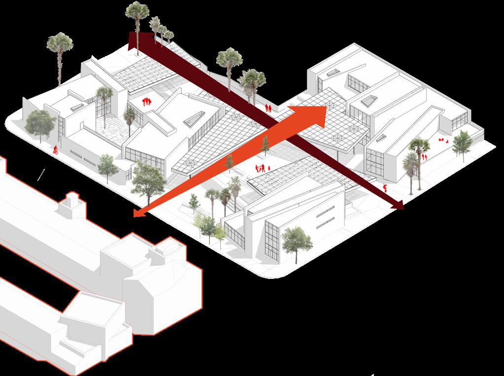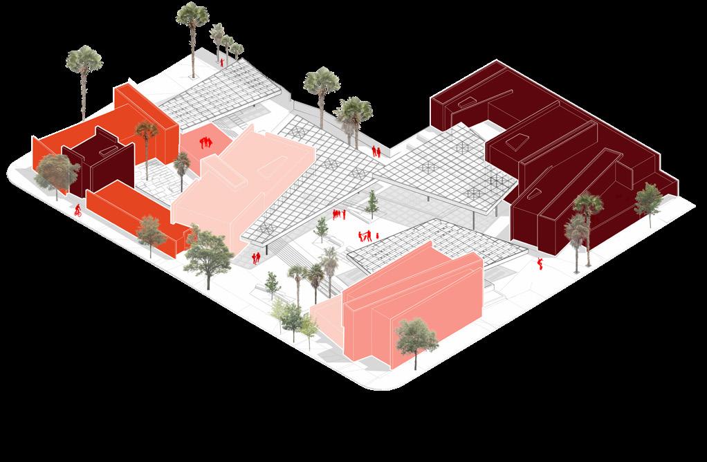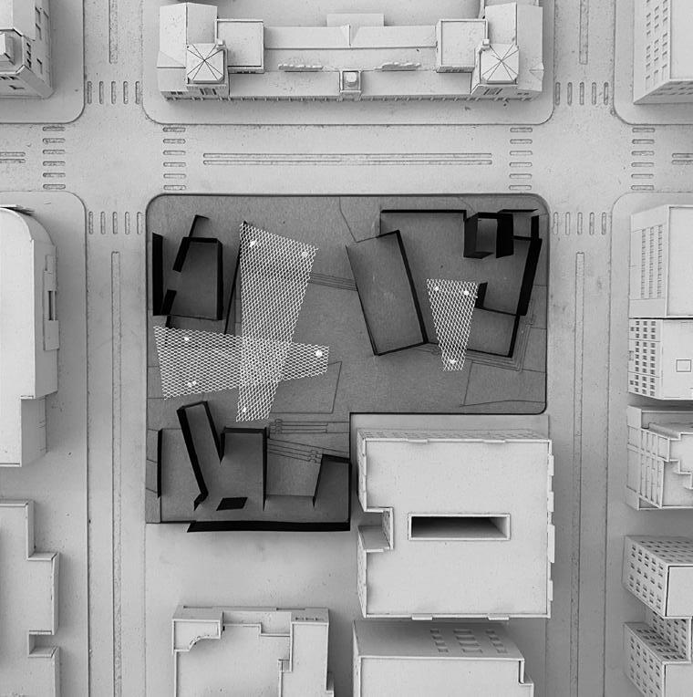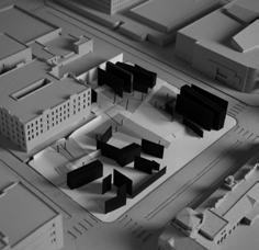 Massing iterations explore applied geometries, topography manipulation, and the integration of overhead planes. The immediate context informs key site entries and encourages a direct relationship with the historic Chapman Market. Building masses are rotated and organized to create ad-hoc public space of all scales, supporting activism that creates change.