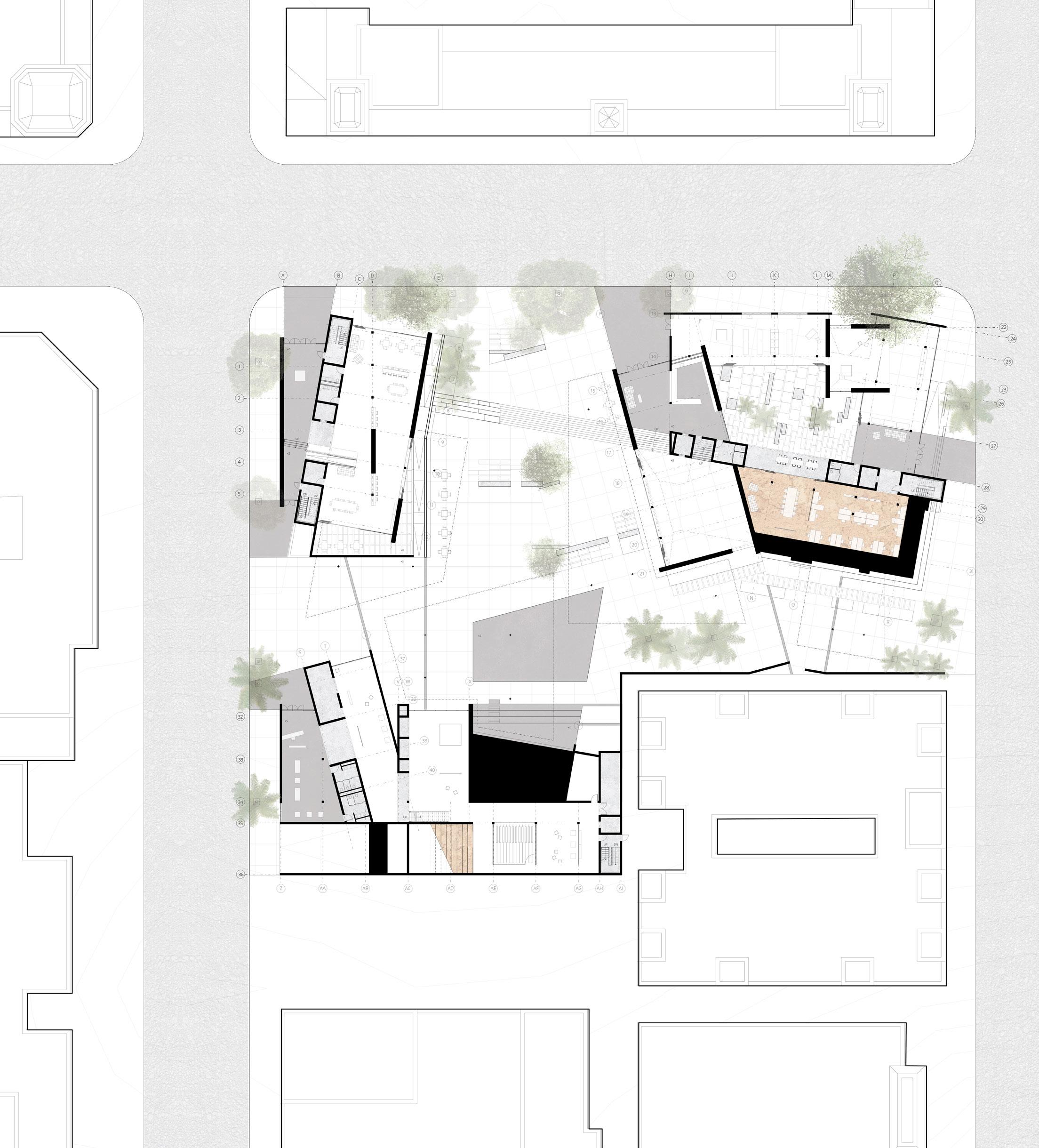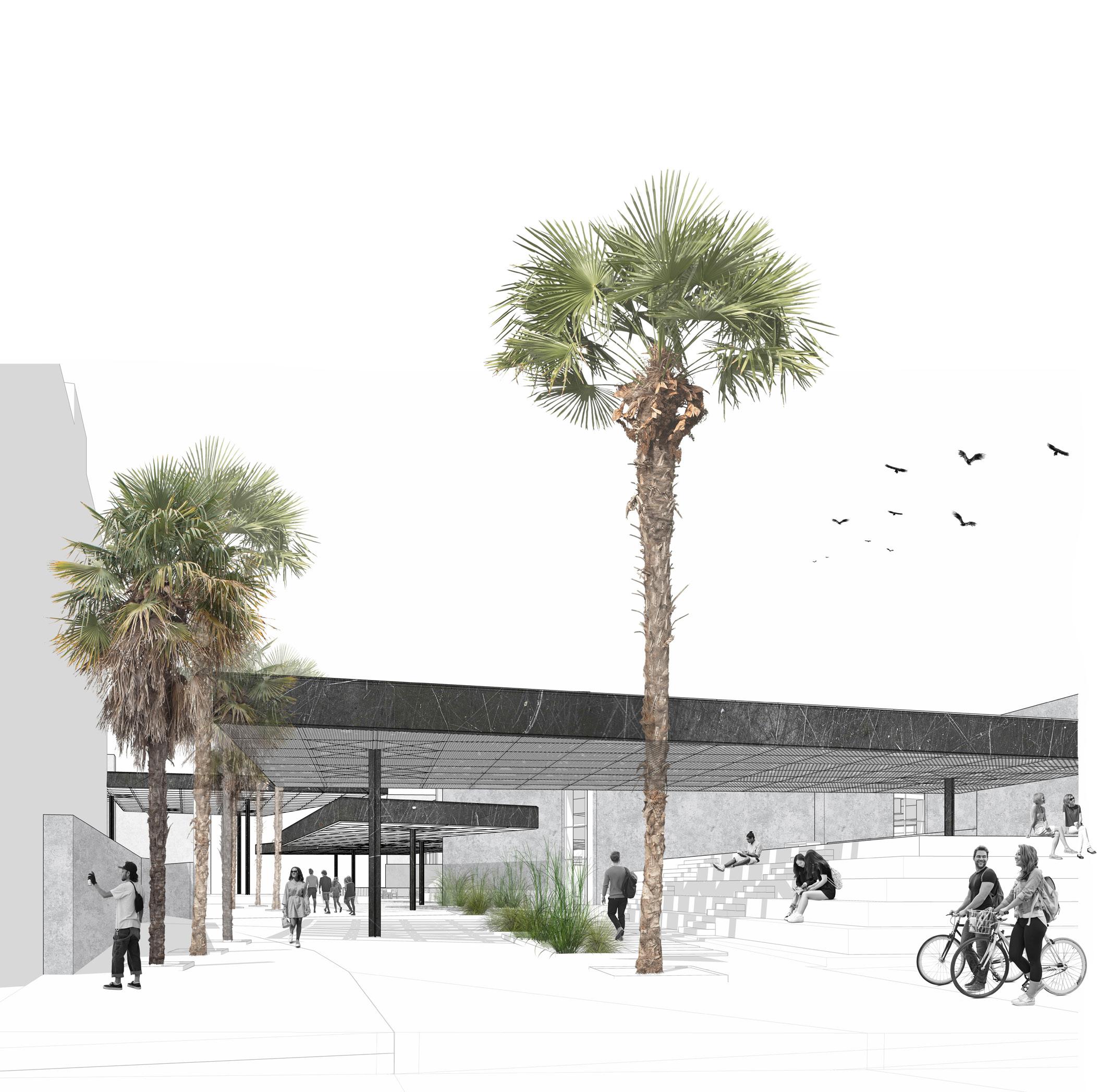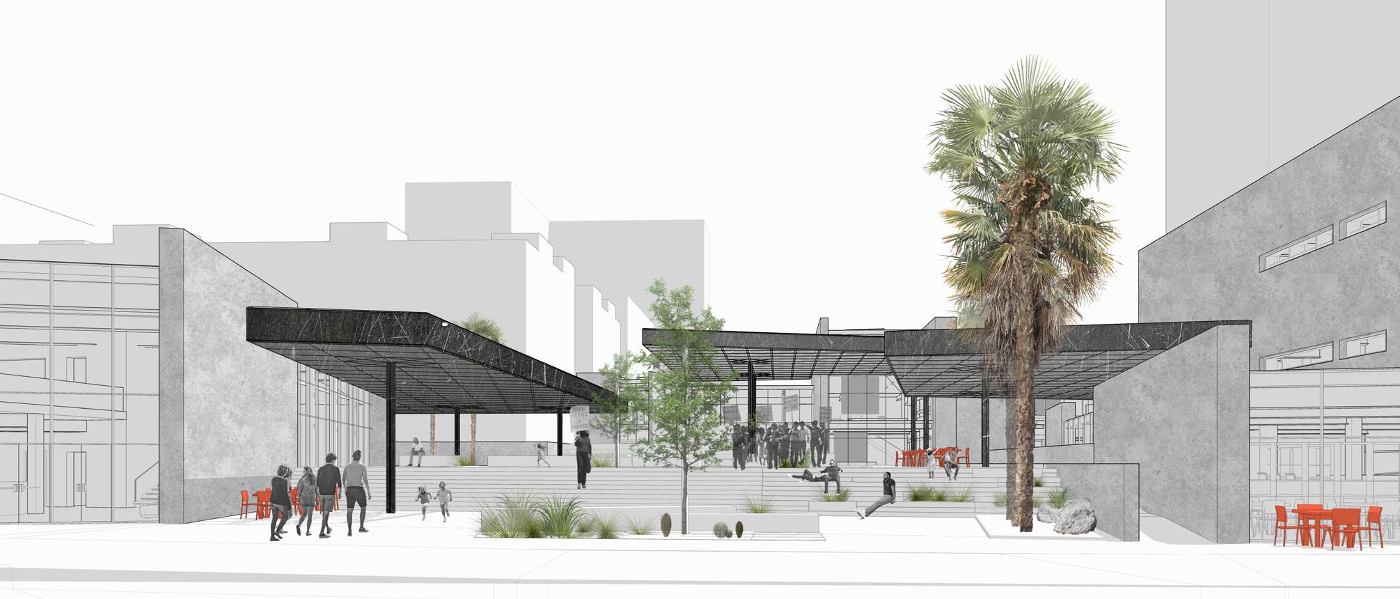 Defined by vertical CMU walls and metal mesh overhead planes, the public space becomes a place for activity, activism, and art. Continuing the language of the buildings, permanent and movable seating supports a variety of postures and events, while vegetation and trees work with these built elements to add liveliness and increase comfort.