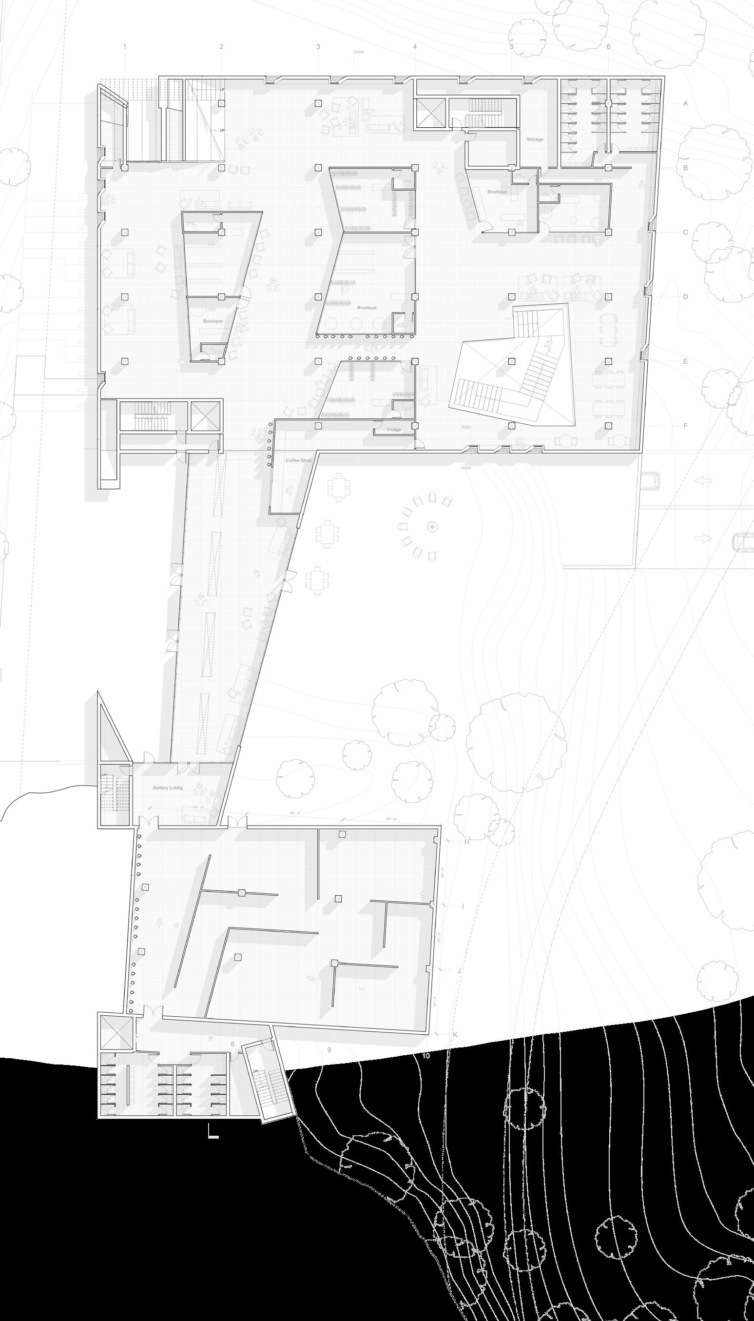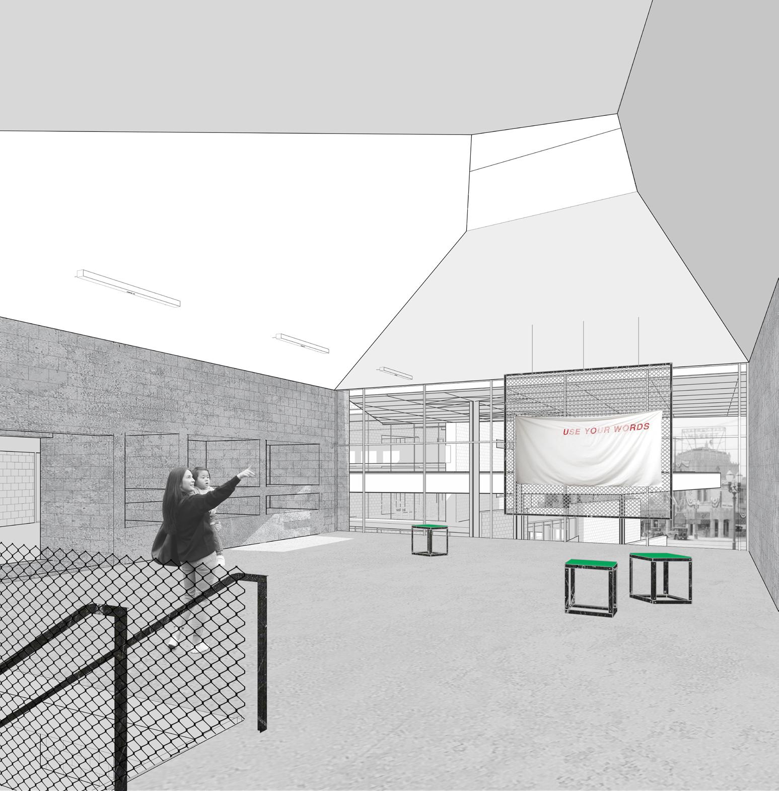 The central exterior space invites the public into the site to support the public nature of activism and encourage the convergence of individuals and ideas. An occupiable stair allows for a procession from Chapman Market to the gallery along the primary axis.