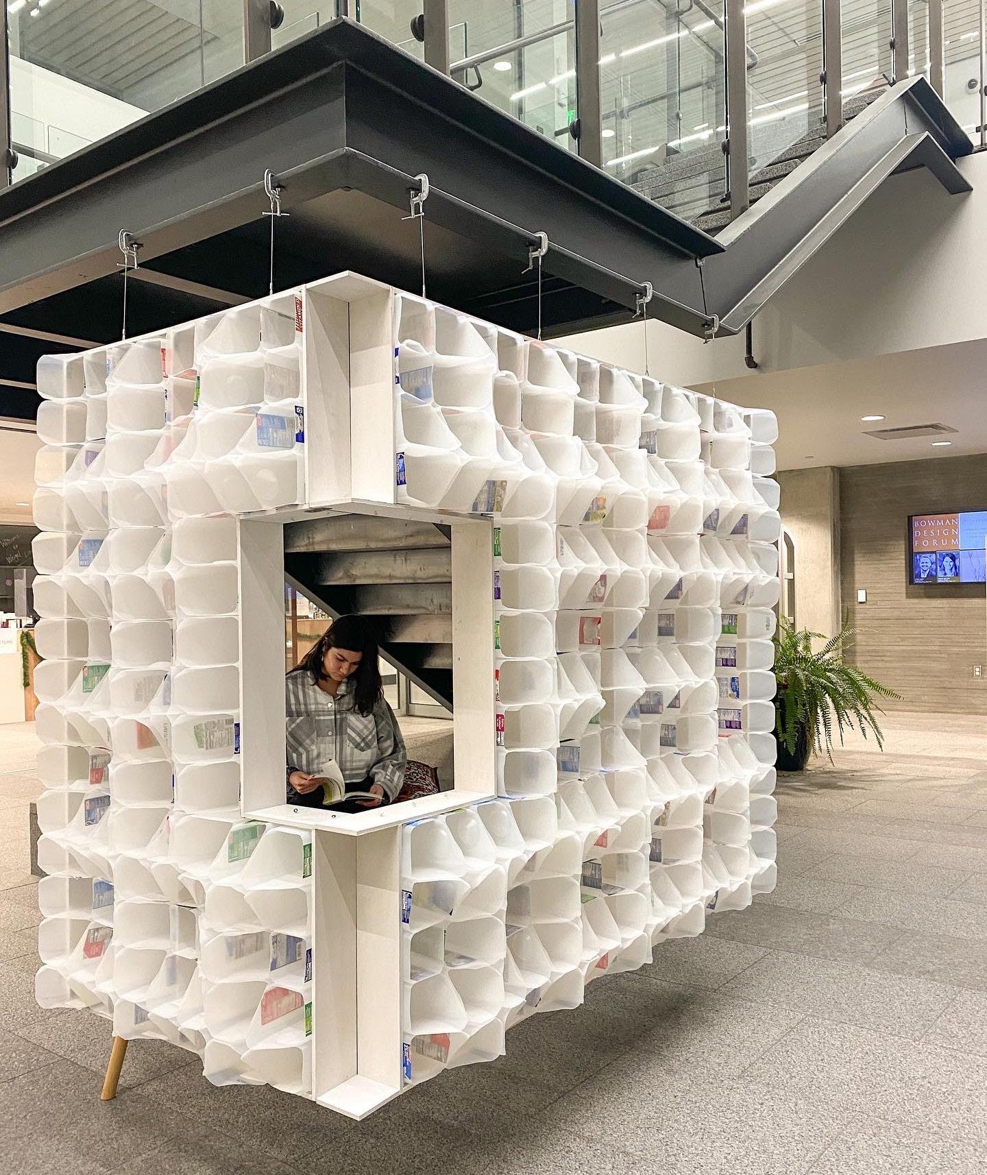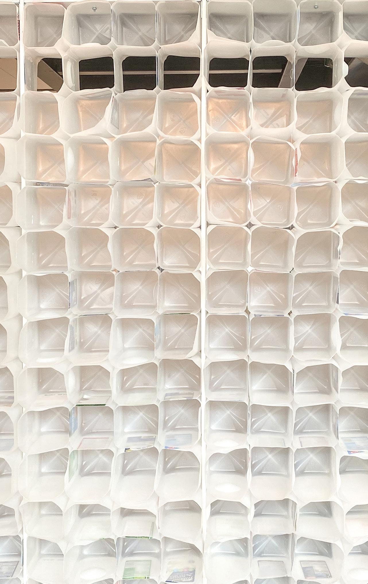 With an emphasis on sustainability and wall craft, [c 2 h 4 ]ange approaches the design of a partition system through the innovative reuse of plastics. The modular strategy employed is based off the individual unit of the milk jug and allows for implementation at various scales. Individual units are modified to enable for filtering of light, framing of views, and sculptural shaping of space. Taking advantage of the lightweight nature of this material, the system is suspended from a structure above using clamps, cable, and fishing line.