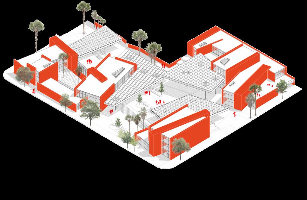 Innovative use of low-cost materials allows the non-profit center to thrive while recognizing economic means. Overhead structures are constructed with steel components and polycarbonate sheets which support the integration of solar panels. Within the buildings, the concrete vertical structure compliments the horizontal steel members.