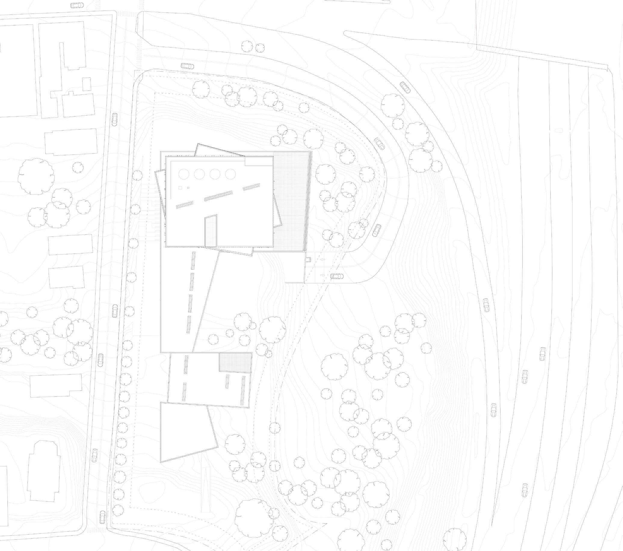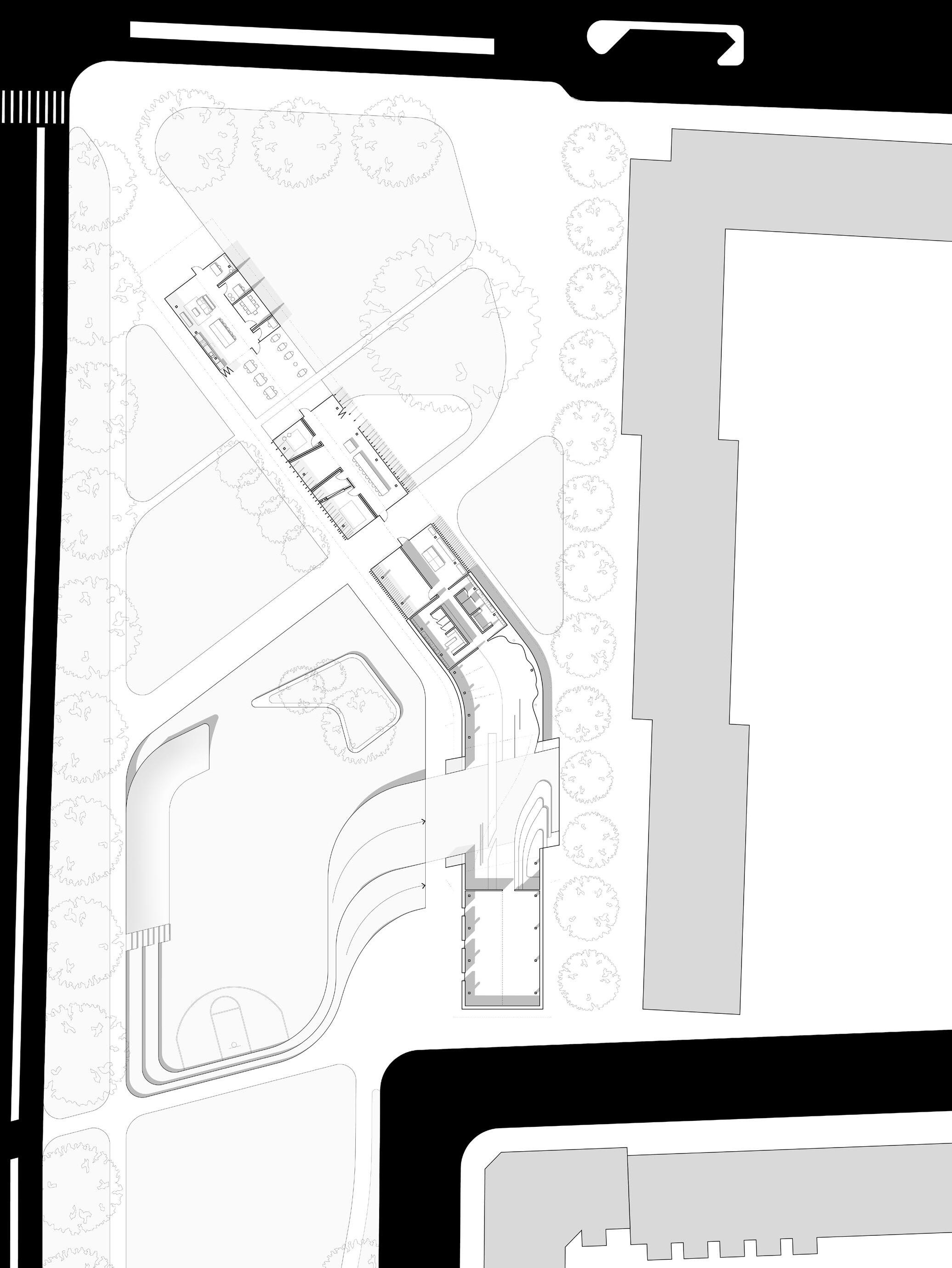 Fredens Park only exists because of buildings demolished in preparation for the Søringen highway plan. A reimagining of this plan as a greenbelt through the city reveals a series of spaces that support the scale and movement of the individual, rather than that of the vehicle. Formally, this structure builds on the vernacular gabled architecture of the region, while imparting a new approach. The roof form that serves as a pavilion within the greater park pulls up on either end, emphasizing the unconventional glass structure in the center. Activated by users and blurring the boundaries between interior and exterior, this street culture house becomes a hub for youth activity and redefines the street as a place for people.