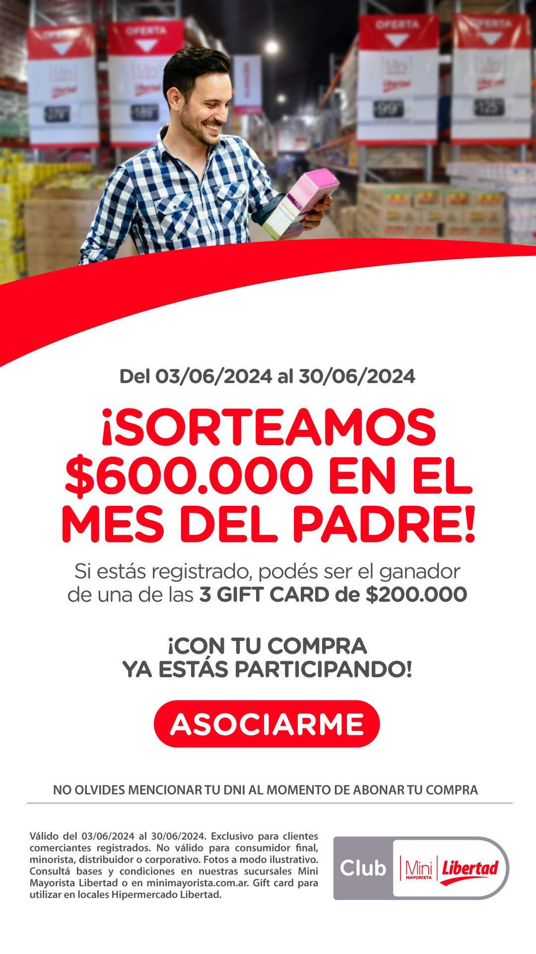 DEL 21/04 AL 31/07/2024 suscribiéndote a por whatsapp al 351 3050396 $30.000 TENÉS PARA TU COMPRA EN UNA VEZ INSTALADA TU SUSCRIPCIÓN A DIRECTV, TE ENVIARÁN UNA GIFTCARD POR $30.000 PARA UTILIZAR EN MINI MAYORISTA LIBERTAD. EXCLUSIVO PARA CLIENTES COMERCIANTES REGISTRADOS EN CLUB MINI MAYORISTA LIBERTAD. CONSULTÁ BASES Y CONDICIONES EN NUESTRAS SUCURSALES MINI MAYORISTA LIBERTAD O EN WWW.MINIMAYORISTA.COM.AR TENEMOS ESTE BENEFICIO PARA VOS. POR SER CLIENTE