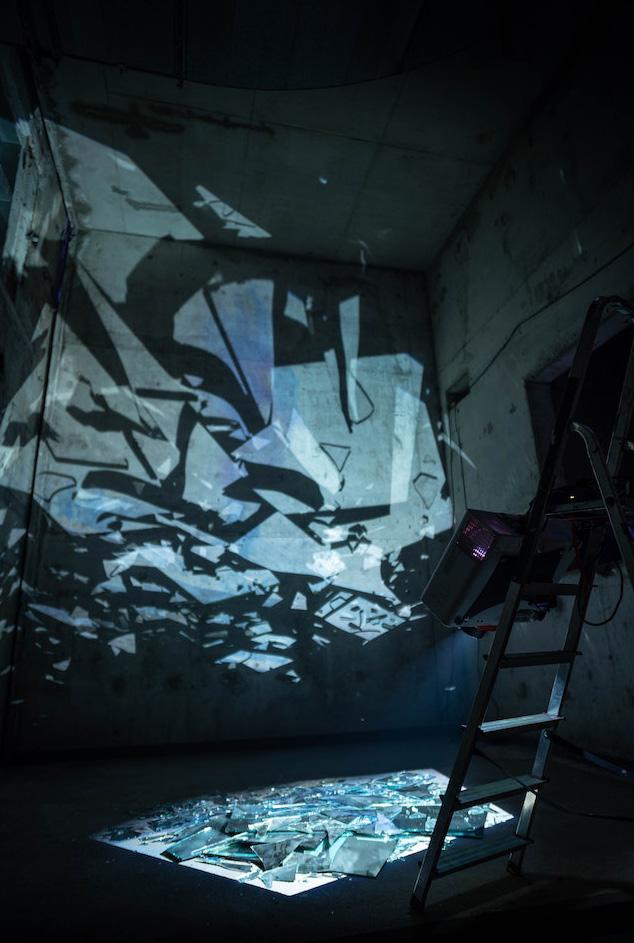 In a stint of anger, he spits on his hand and rubs, pressing against the wall vigorously, attempting to wipe off, or at least mask his reflection. But this is to no avail. Bright beams of red, the same shade as his lids, cascade down those high walls and vaporize the markings he had left.