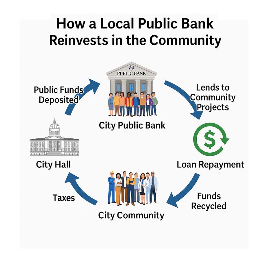 City Hall puts public funds into a public bank, which lends them for local needs like housing. As loans are repaid, the money is recycled, keeping public dollars working for the community.