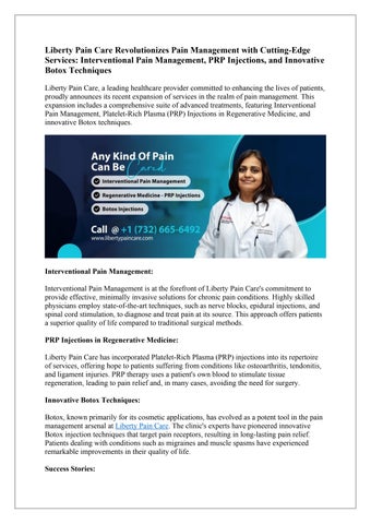Liberty Pain Care is a leading healthcare provider dedicated to delivering innovative and effective pain management solutions. With a team of skilled physicians and a commitment to patient well-being, Liberty Pain Care aims to enhance the quality of life for individuals suffering from chronic pain conditions. Through state-of-the-art treatments and a patient-centered approach, Liberty Pain Care continues to be a trusted source of relief for its patients.