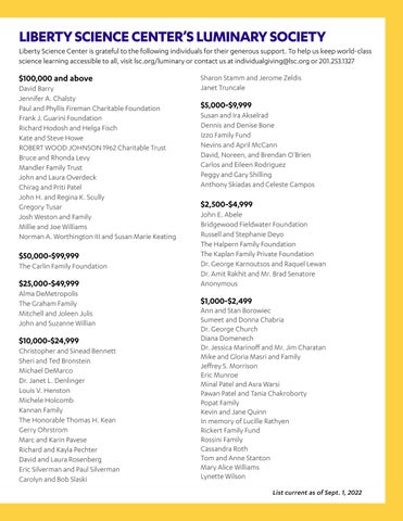 Liberty Science Center is grateful to the following individuals for their generous support. To help us keep world-class science learning accessible to all, visit lsc.org/luminary or contact us at individualgiving@lsc.org or 201.253.1327
