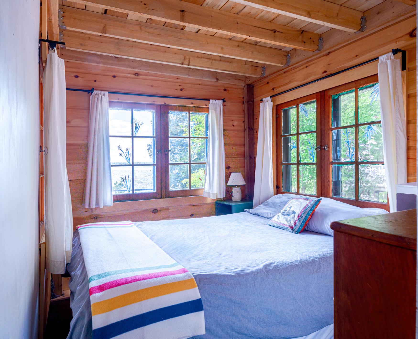 The sunlit cottage master bedroom boasts natural light streaming in from two sides, complemented by stunning views over the lake.
