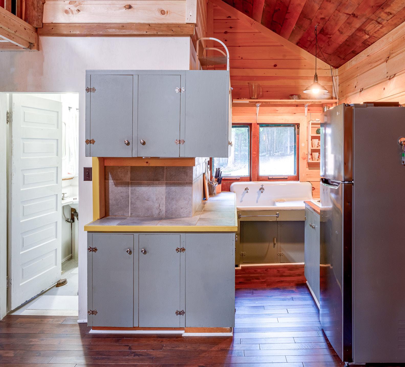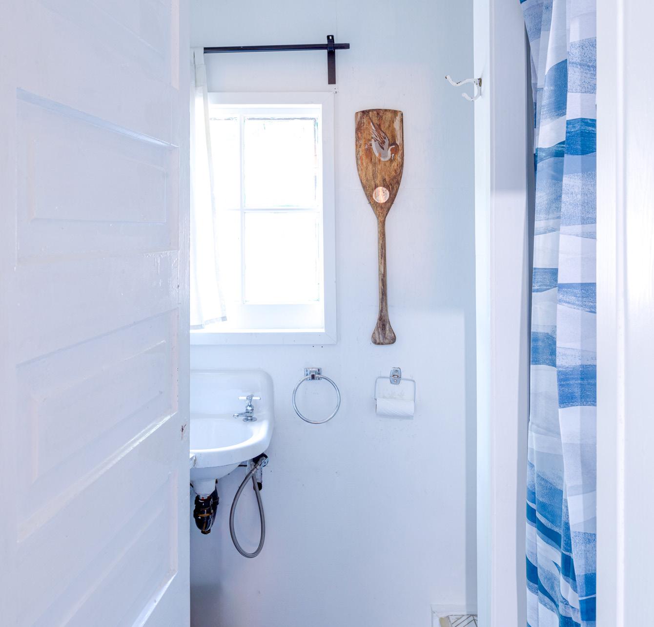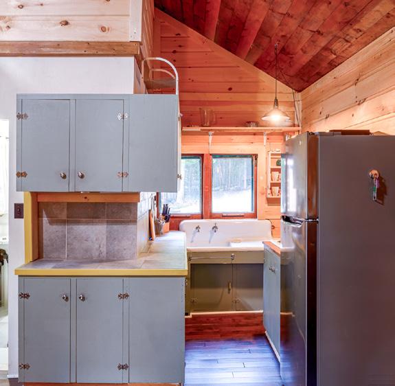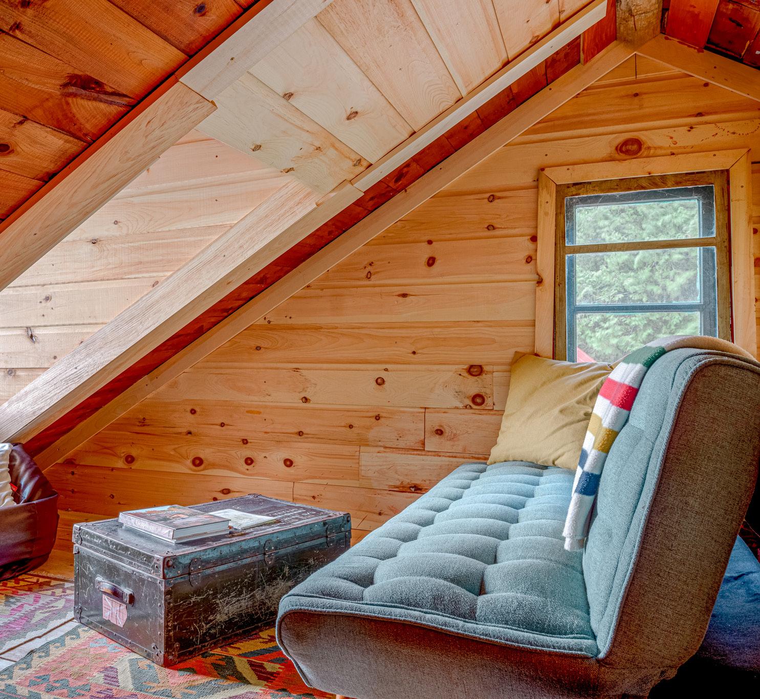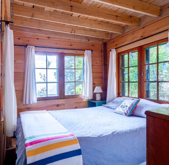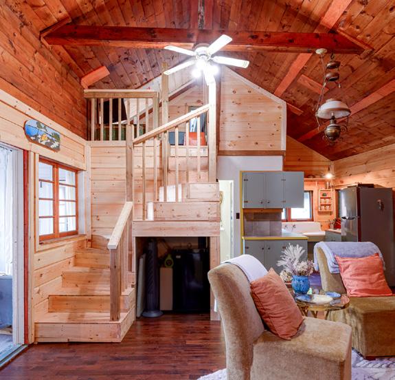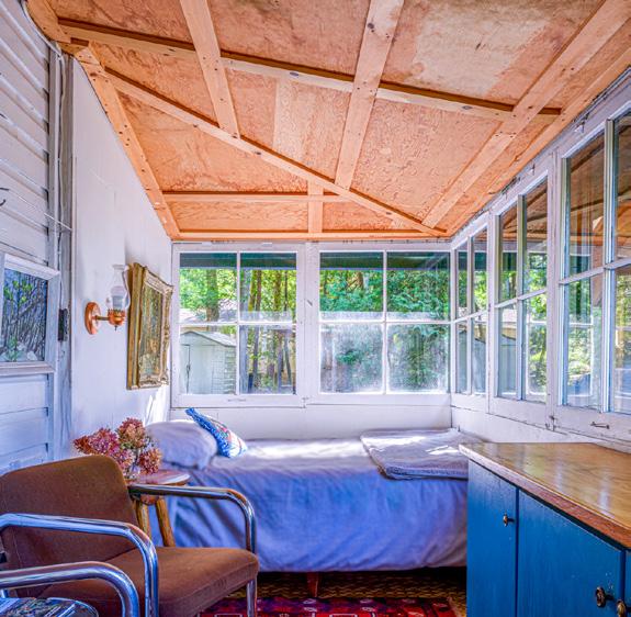 Inside, the cottage’s essence remains rooted in its history, with tongue-ingroove pine walls, wooden beams, and a distinctive gambrel-style ceiling harkening back to its origins.