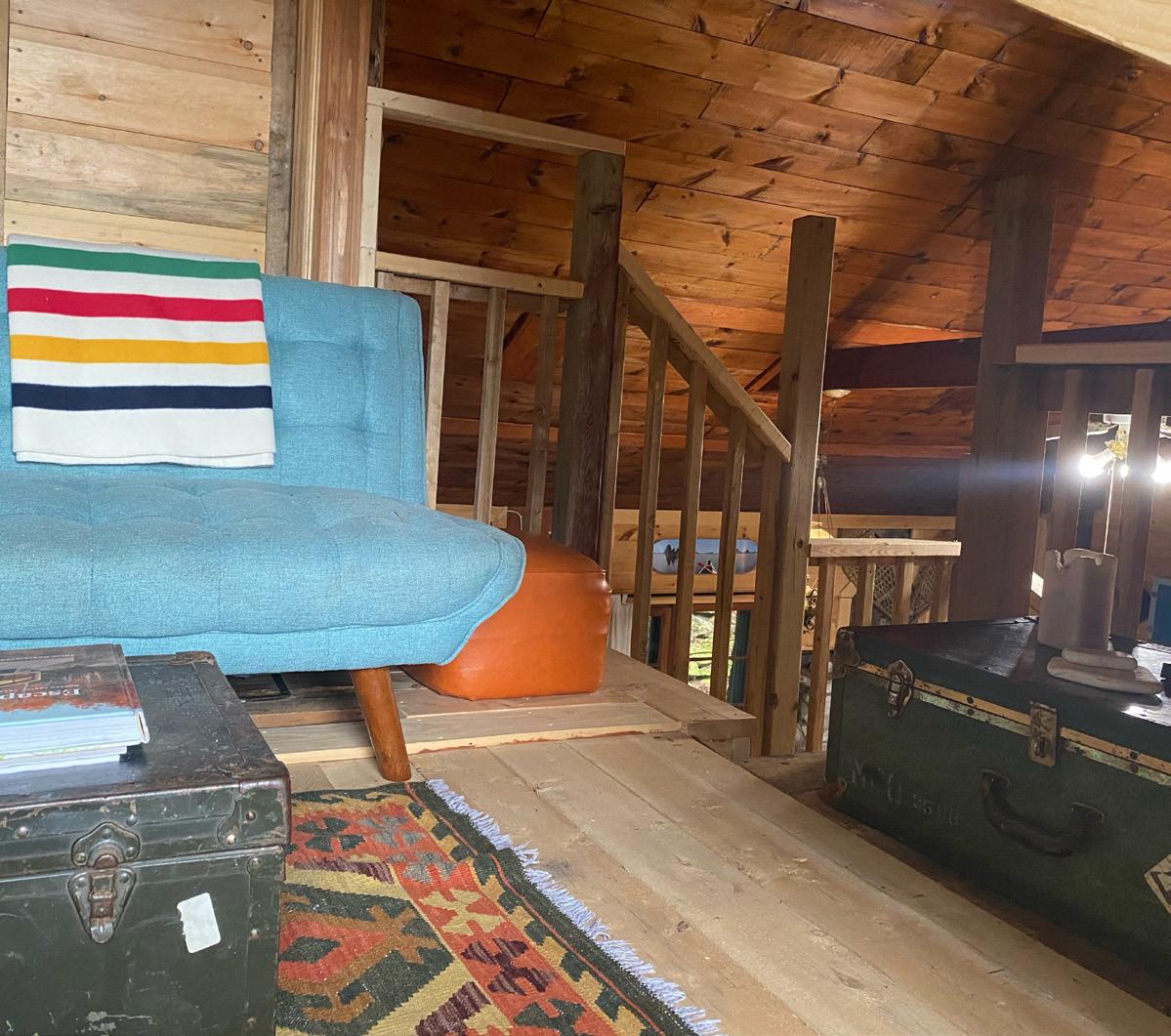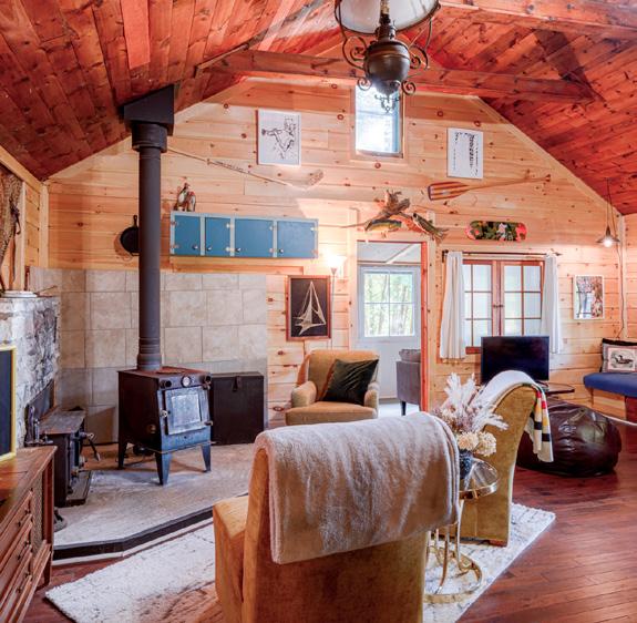 The open-concept living area welcomes you with the crackling woodstove fireplace and a cozy lounge featuring a vinyl player, TV and an array of board games for entertainment.