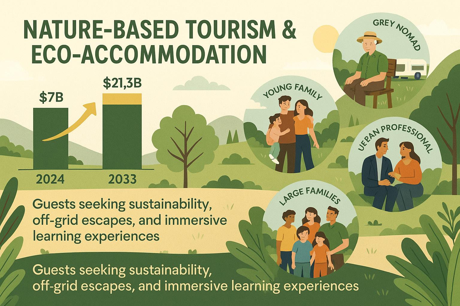 The Australian eco-tourism market is forecast to grow from $7 billion in 2024 to $21.3 billion by 2033 (IMARC Group), while nature-based tourism has surged by 47% among Australians since 2014 (Austrade).