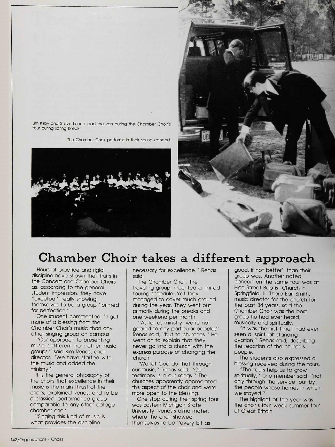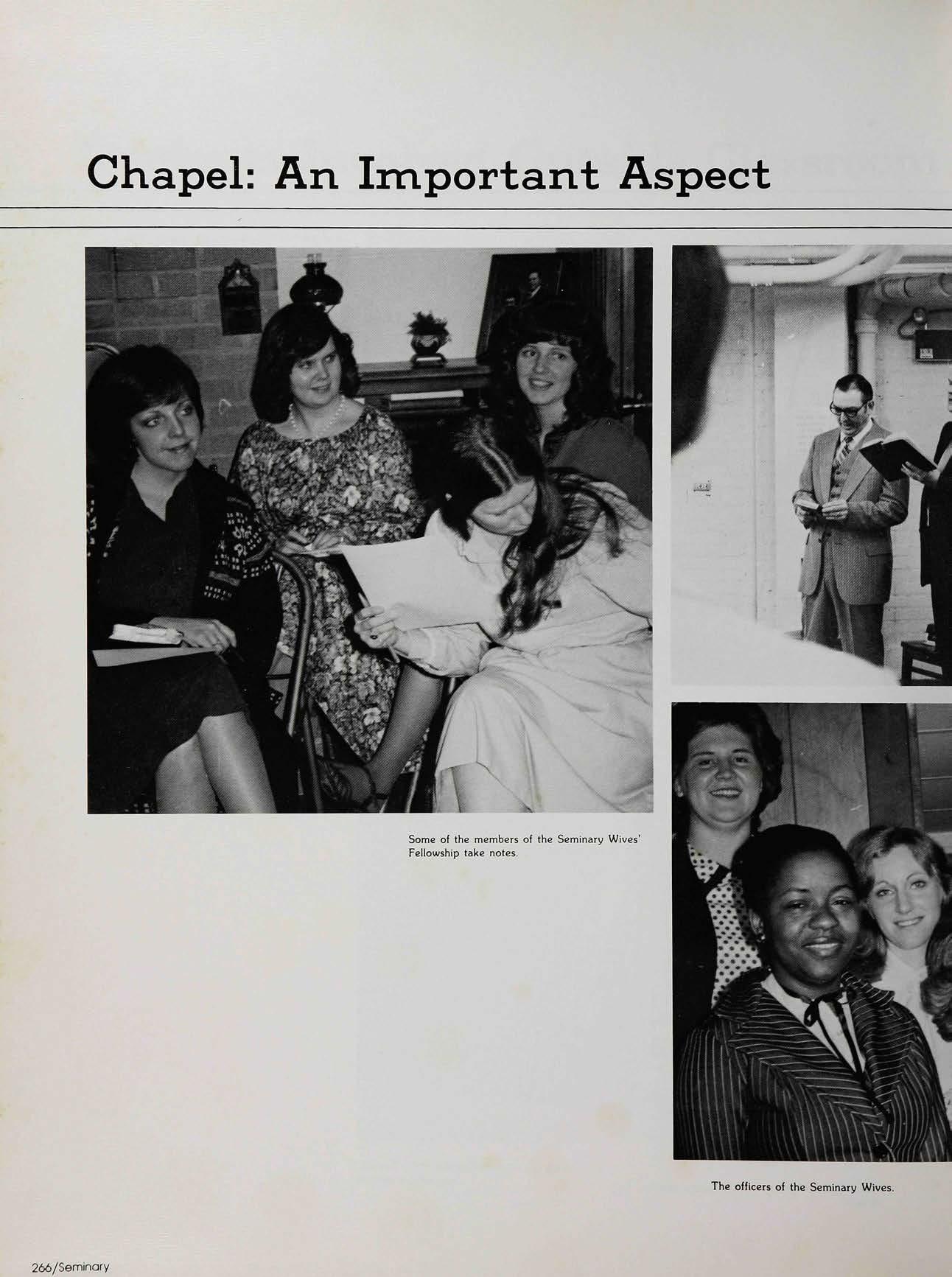 Among the most important activities conducted outside the classroom was chapel Although students of allLiberty Baptist Schools met on Wednesday for a combined chapel, the seminary conducted itsown on Friday. Guest speakers and special musicians were frequent One of the most active groups was the Seminary Wives' Fellowship The group met frequently to share in a time of fellowship and fun.