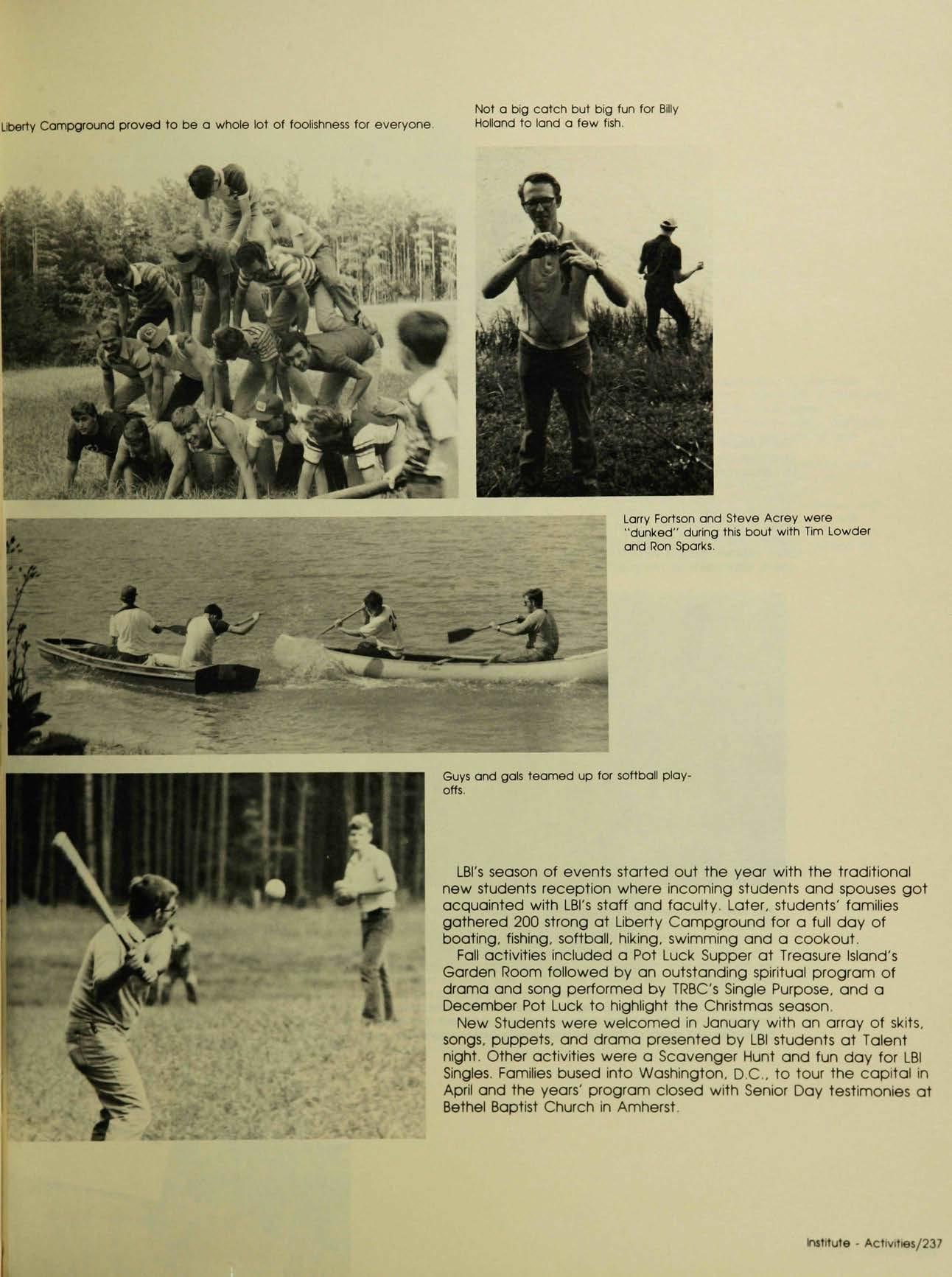 Apart from classroom work, the students of Liberty Baptist Seminary were involved actively in outside functions At Seminary For A Day, students shared their time with prospects in an effort to recruit new students Social activities such as banquets were high times of the year These various extra activites made the seminary a place for a well-rounded education