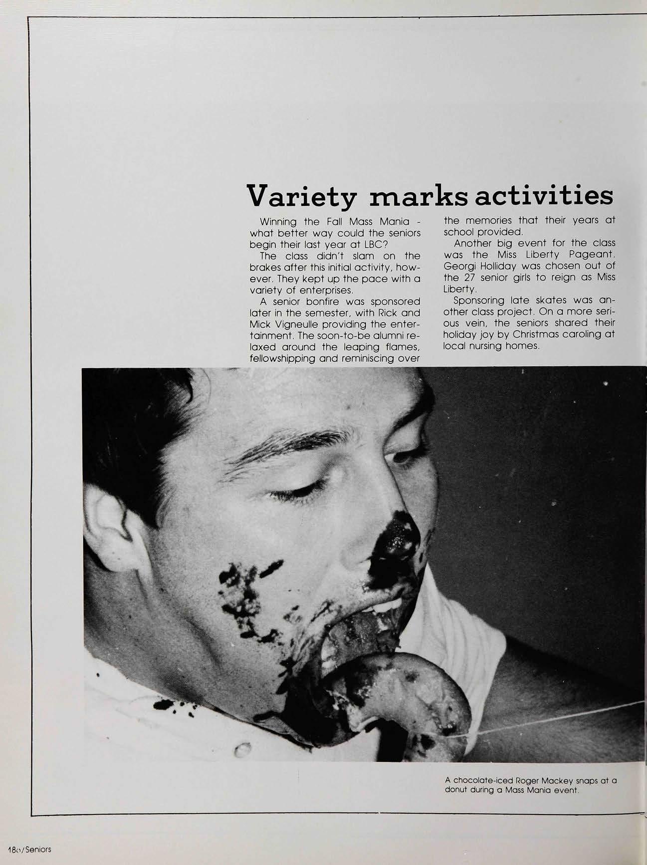 More than ever before, LBC seemed together, moving as a whole. The student body rolled up their sleevesforthe Red Cross Blood Drive.They pitched pennies intoa fund which purchased a surprise appreciations giftfor Dean Dobson. They threw their politicalpunch into opposing SALT II and ERA, They dressed inclothes from another era on 50's day. They presented LBC's first musicalplay.