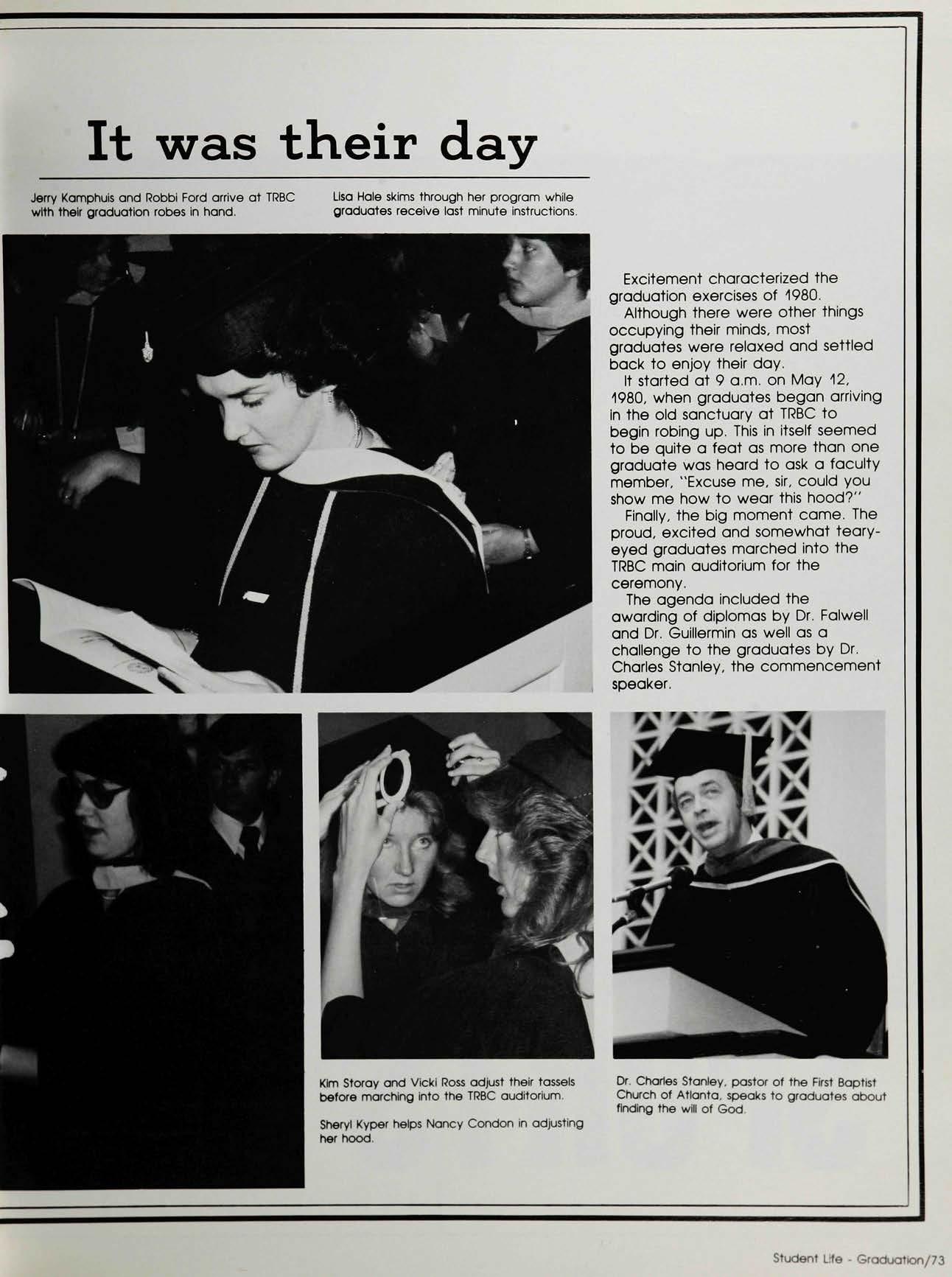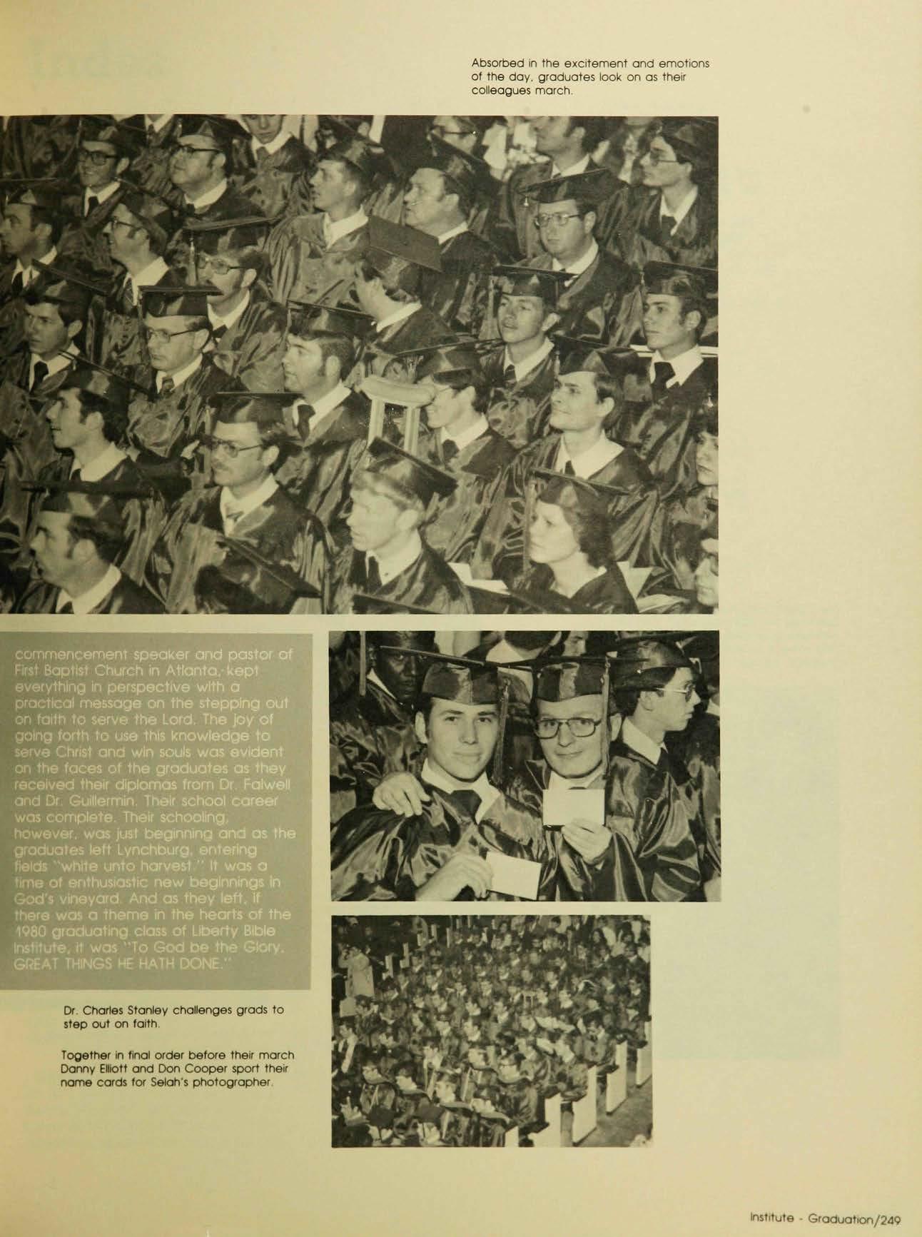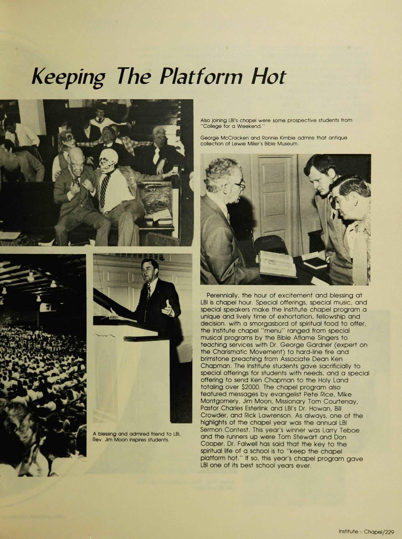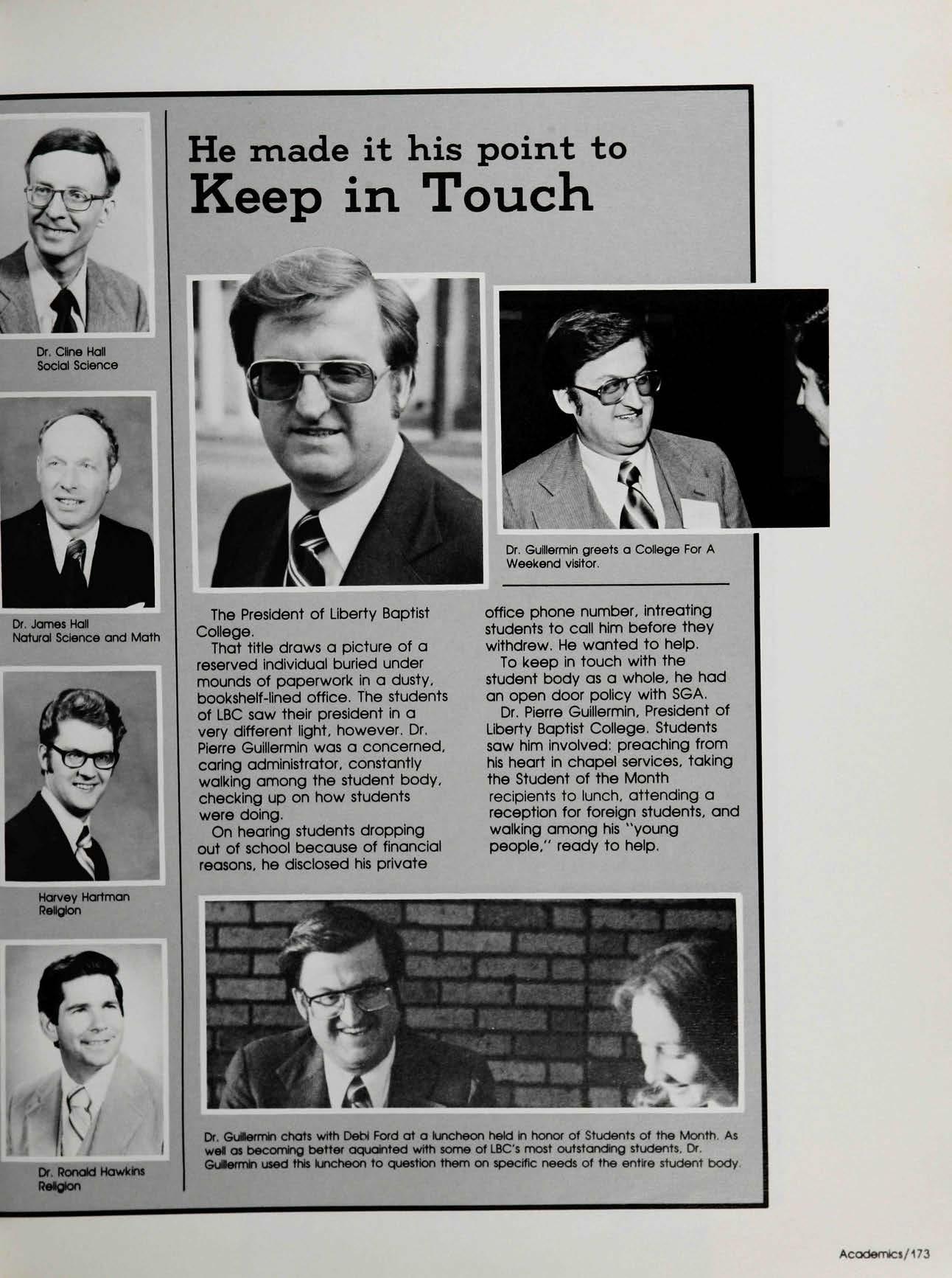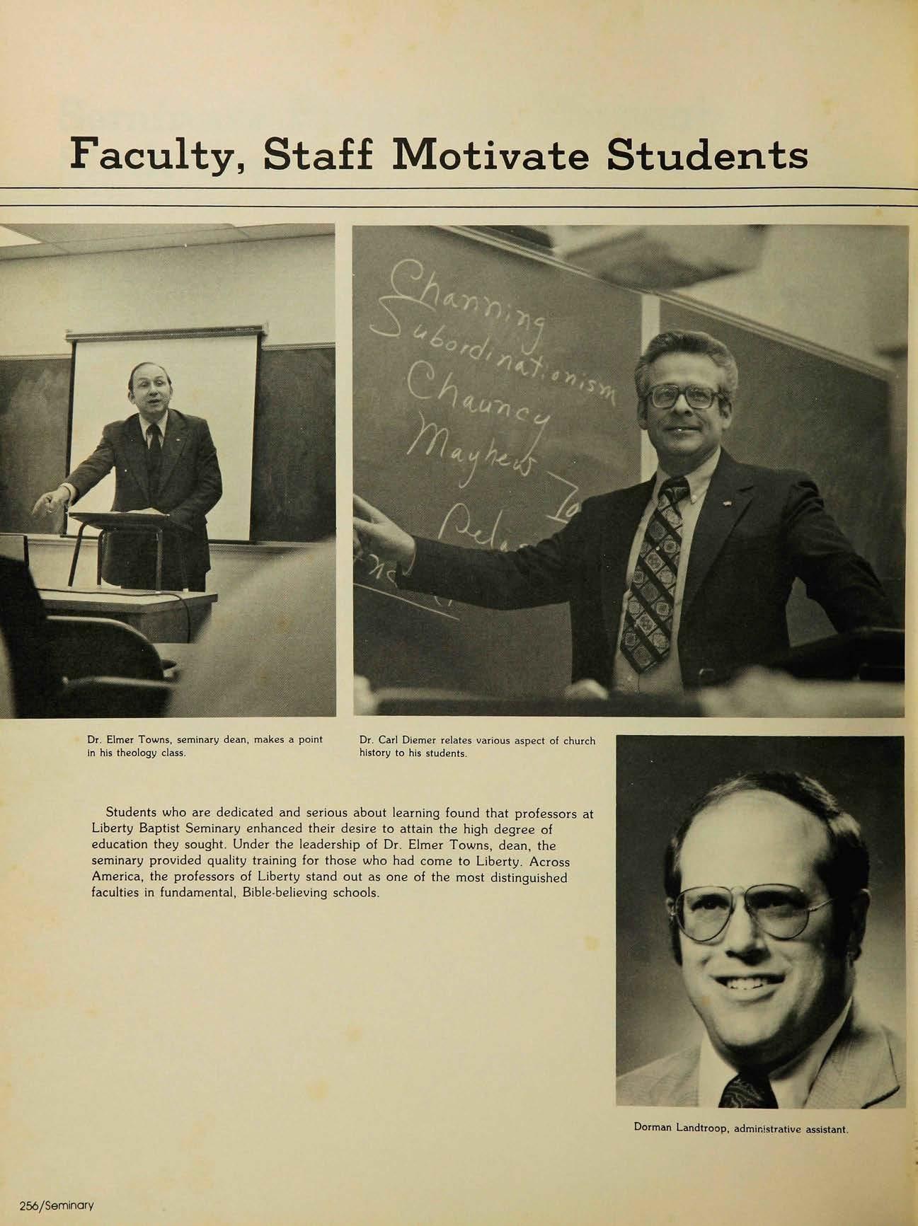 Students whoare dedicated andserious about learning found that professorsat Liberty Baptist Seminary enhanced their desire toattain the high degree of education they sought. Under the leadership ofDr. Elmer Towns, dean, the seminary provided quality training for those who had come toLiberty Across America, the professors ofLiberty stand out asone ofthe most distinguished faculties in fundamental, Bible-believing schools