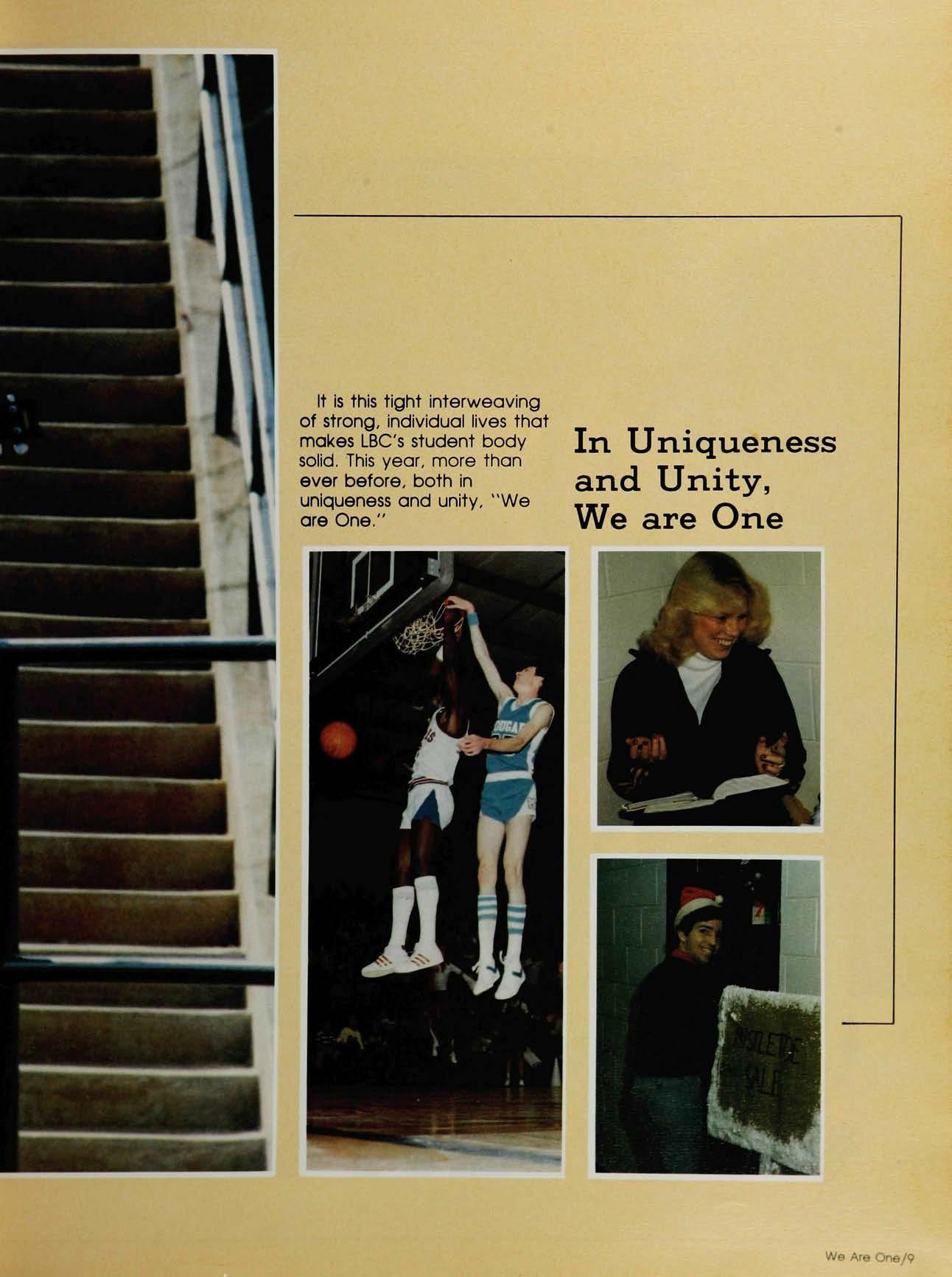 It is thistight interweaving of strong,individual livesthat makes LBC's student body solid.Thisyear,more than ever before,bothin uniqueness and unity, "We are One."