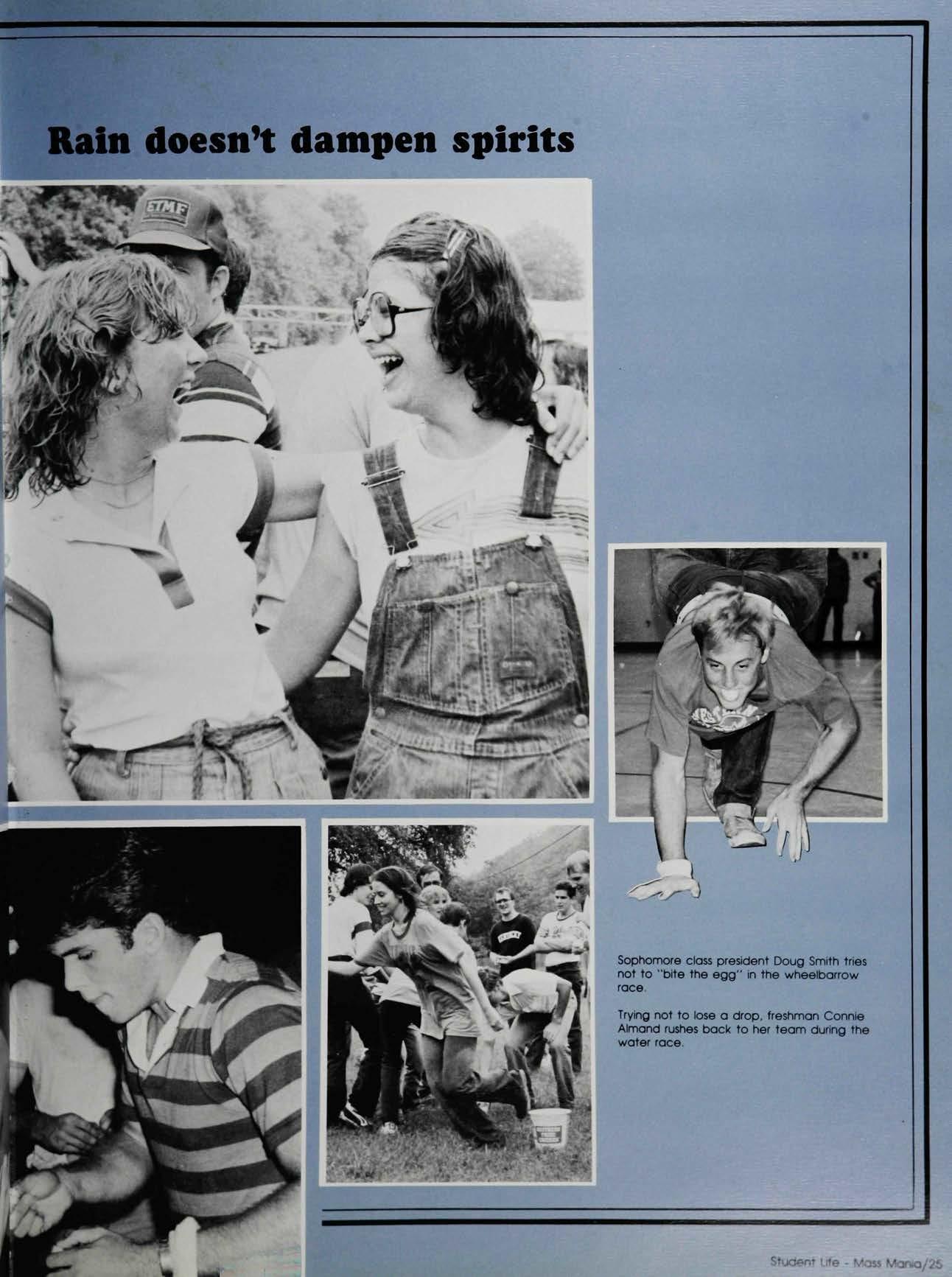 SGA members searched for weeks trying to come up with different and unusual games to play Some of these were: Human Croquet, Blind Man's Chase, Crab Soccer,Greased Watermelon, and various water races. Winding up the day was a steeple-chase on campus that contained approximately 40 different events Inspite of the weather Mass Mania turned out to be an exciting time for allinvolved. Said Deb Austin,a sophomore from Maryland, "Seeing everybody get loose and fancy-free was exciting for me! It was fun just being ourselves."