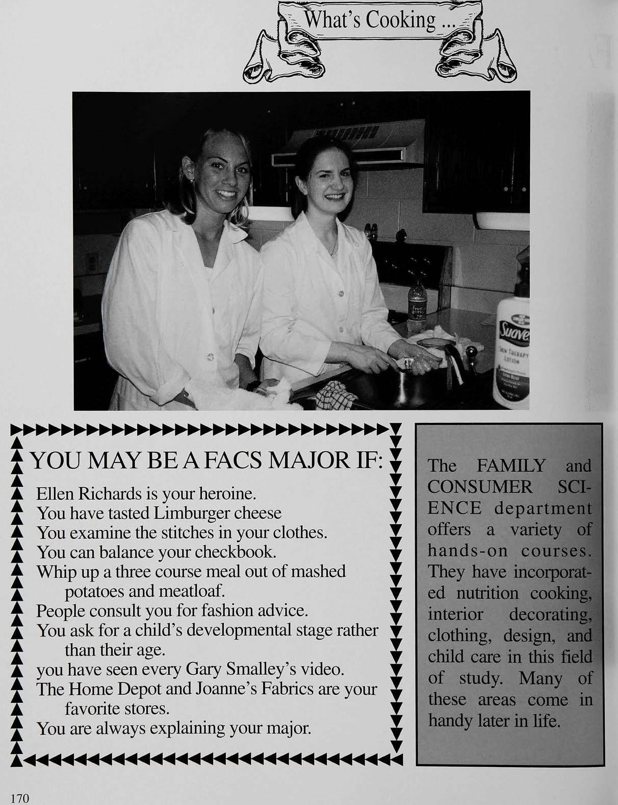 The FAMILY and CONSUMER SCIENC E department offers a variety of hands-on courses. They have incorporated nutrition cooking, interior decorating, clothing, design, and child care in thisfield of study. Many of these areas come in handy laterin life.