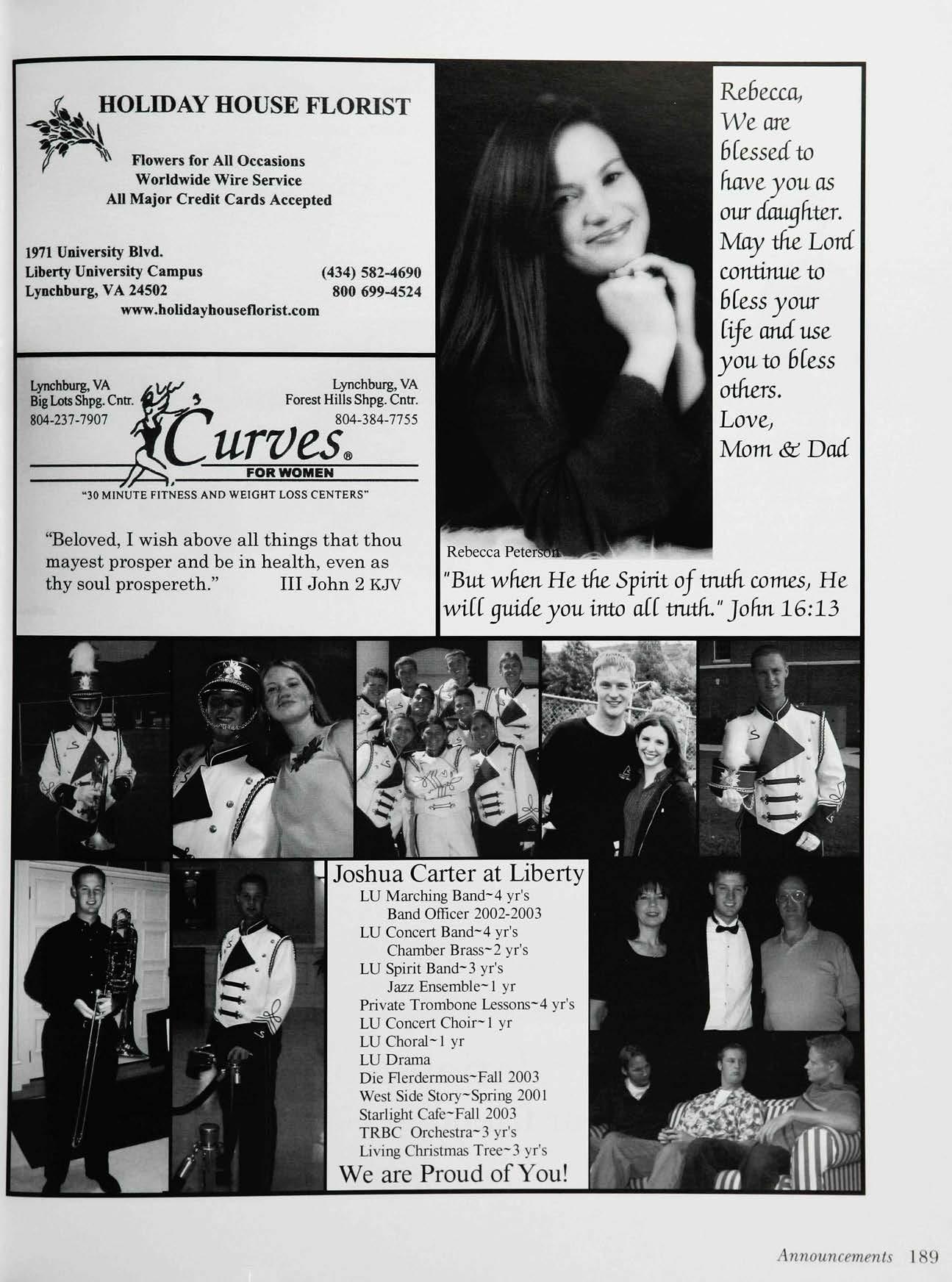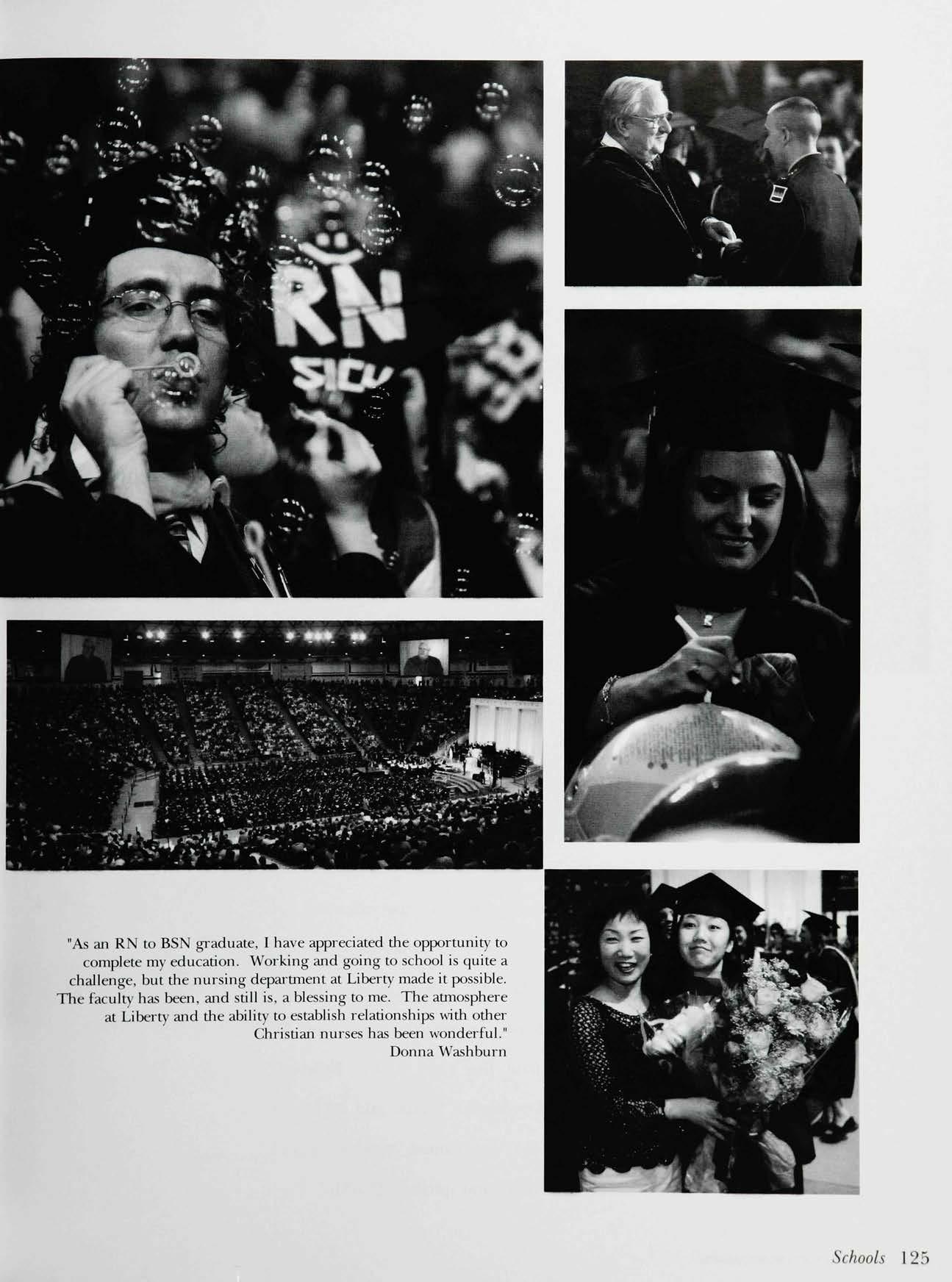 Another new school year brought another year ofdevelopment. Closeto 7,000 undergraduate students attended classes on campus,which brought expanding classrooms and additional faculty Nearly 4,000 ofthose students resided on campus. History began torepeat itself asthe university grounds extended across the community. Memories of the Stewart Arms Hotel that temporarily housed students more than 20 years ago were recounted with familiarity asstudents were again living inarea hotels untilthe completion ofCampus East inNovember 2003 The changing faces and structures on Liberty Mountain tell thestory ofa vision unfolding. Even asthe growth continues and thedream ofone man becomes reality, each person holds a specialpart inthe history being made. Every professor,staffmember, student, prayer warrior andthe countless individuals behind the scenes,help to inscribe theevolving chronicle of Liberty University