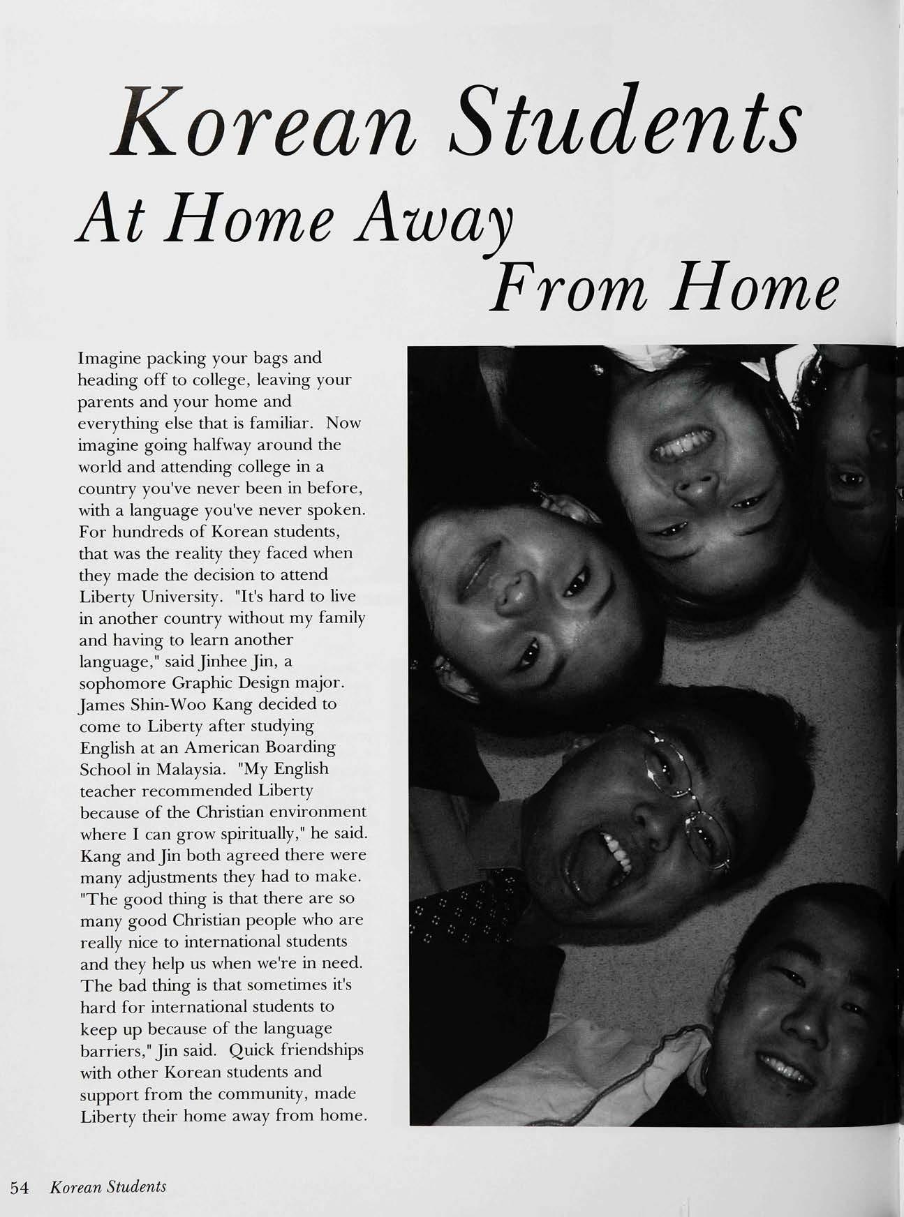 Imagine packing your bags and heading offto college,leaving your parents and your home and everything else thatis familiar. Now imagine going halfway around the world and attending college ina country you've never been inbefore, with a language you've never spoken. For hundreds of Korean students, that was the reality they faced when they made the decision to attend Liberty University. "It's hard tolive in another country without my family and having to learn another language," saidJinheeJin,a sophomore Graphic Design major. James Shin-Woo Kang decided to come to Liberty after studying English atan American Boarding School in Malaysia. "My English teacher recommended Liberty because of the Christian environment where I can grow spiritually,"he said. Kang and Jin both agreed there were many adjustments they had to make "The good thing is that there are so many good Christian people who are really nice to international students and they help us when we're in need The bad thing is that sometimesit's hard for international studentsto keep up because of the language barriers," Jin said. Quick friendships with other Korean students and support from the community, made Liberty their home away from home.