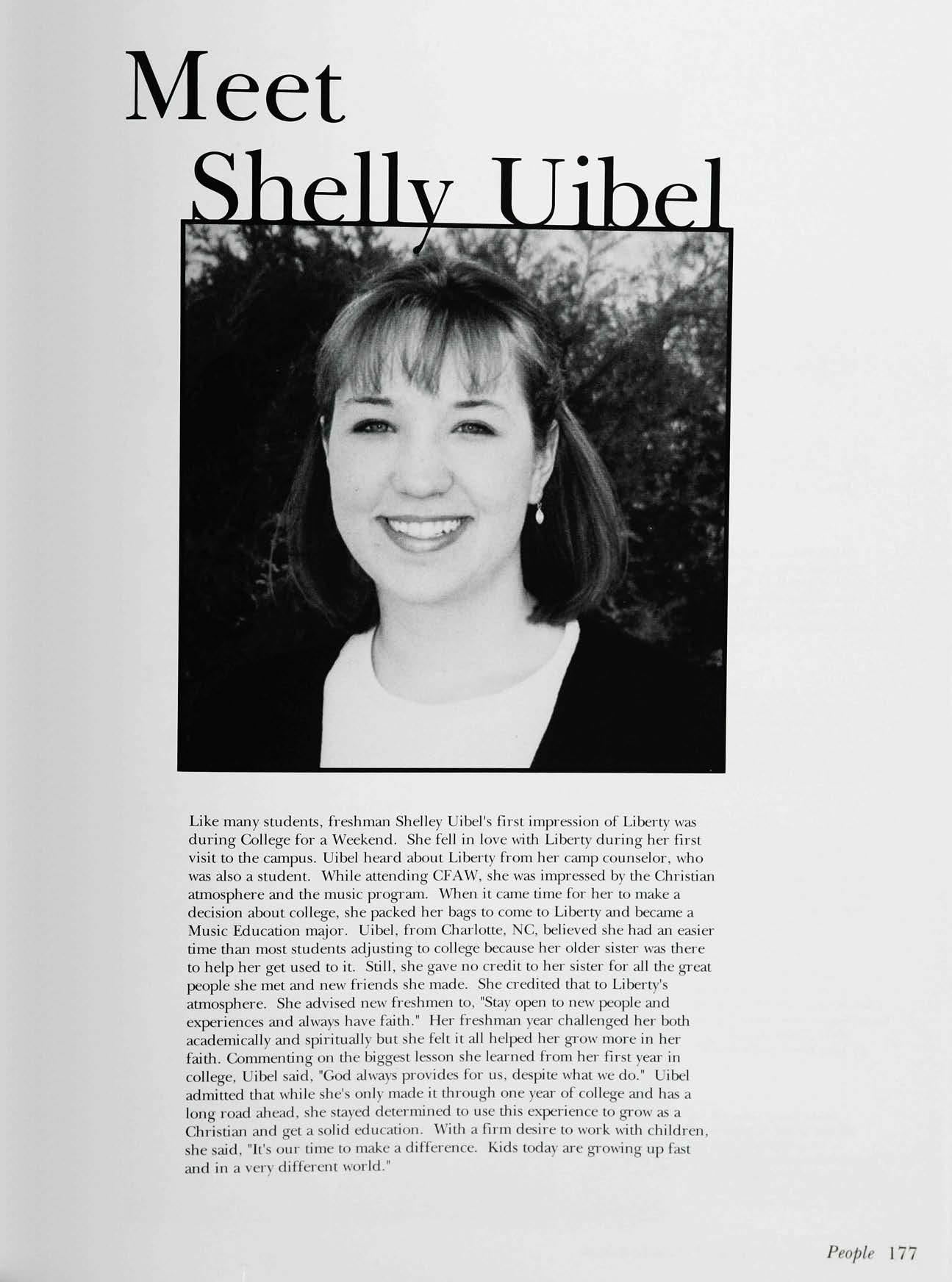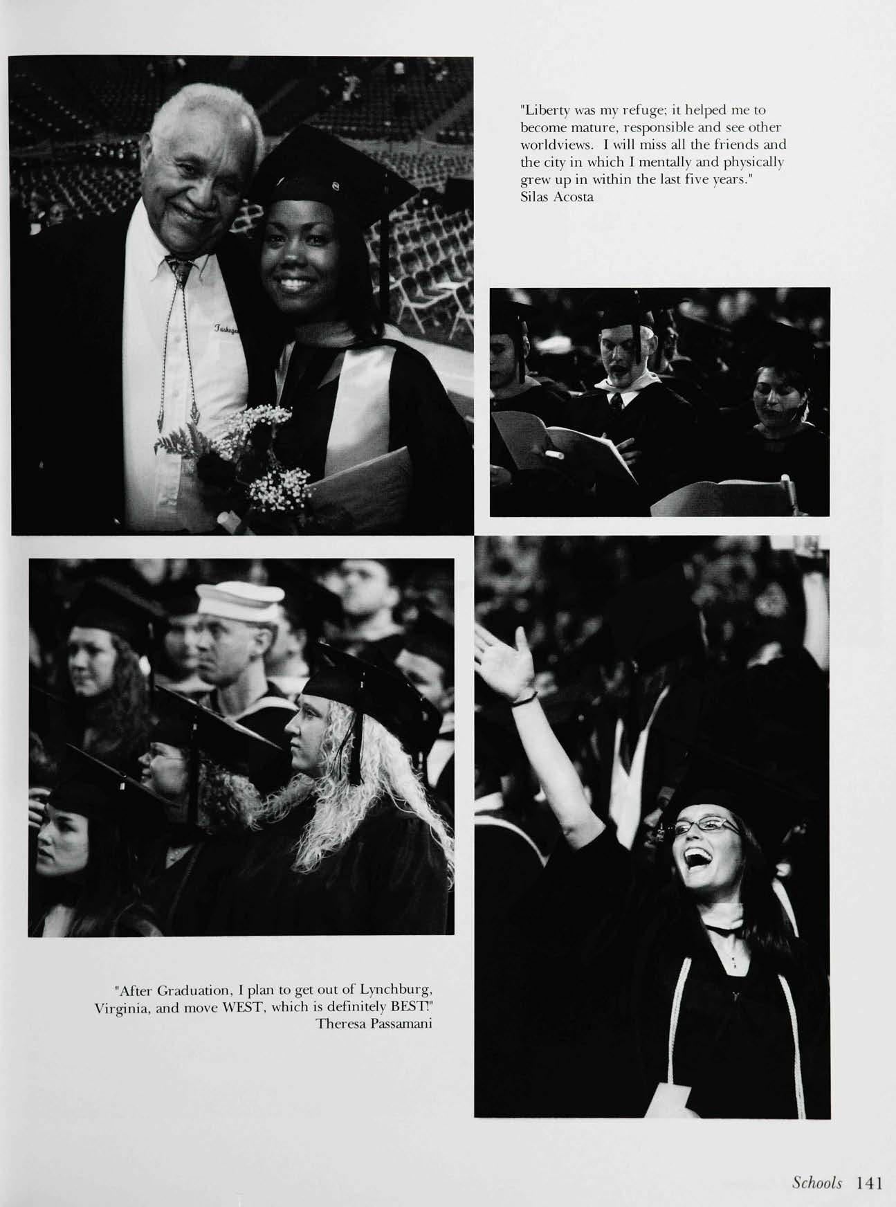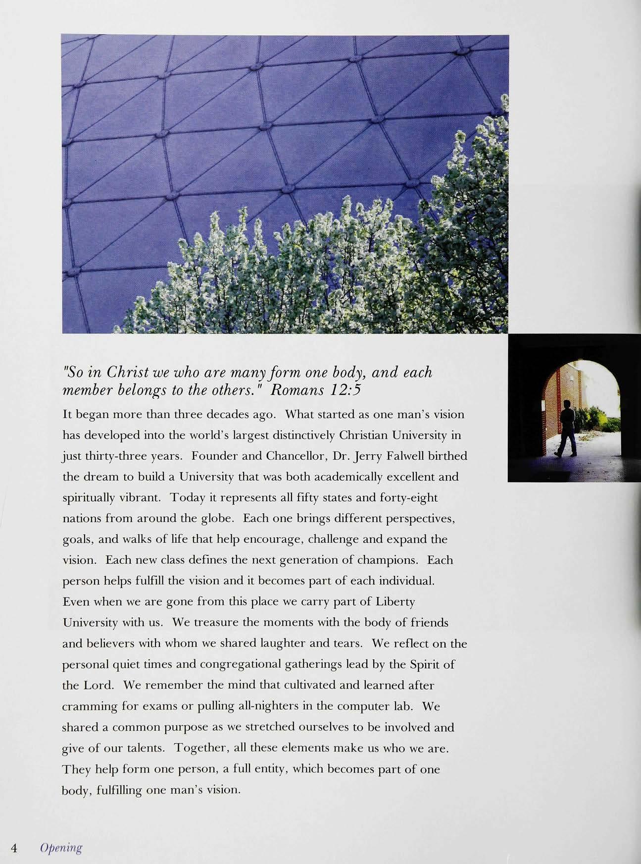 Itbegan more than three decades ago What started as one man's vision has developed into the world's largest distinctively Christian University in just thirty-three years. Founder and Chancellor, Dr. Jerry Falwell birthed the dream to build a University that was both academically excellent and spiritually vibrant. Today itrepresents all fifty statesand forty-eight nations from around the globe. Each one brings differentperspectives, goals,and walks of lifethat help encourage,challenge and expand the vision. Each new classdefines the next generation of champions. Each person helps fulfillthe vision and itbecomes part of each individual Even when we are gone from thisplace we carry part of Liberty University with us W e treasure the moments with the body offriends and believers with whom we shared laughter and tears W e reflecton the personal quiet times and congregational gatherings lead by the Spirit of the Lord. W e remember the mind that cultivated and learned after cramming for exams or pulling all-nighters in the computer lab. W e shared a common purpose as we stretched ourselves to be involved and give of our talents. Together, all these elements make us who we are. They help form one person, a fullentity,which becomes part of one body, fulfilling one man's vision