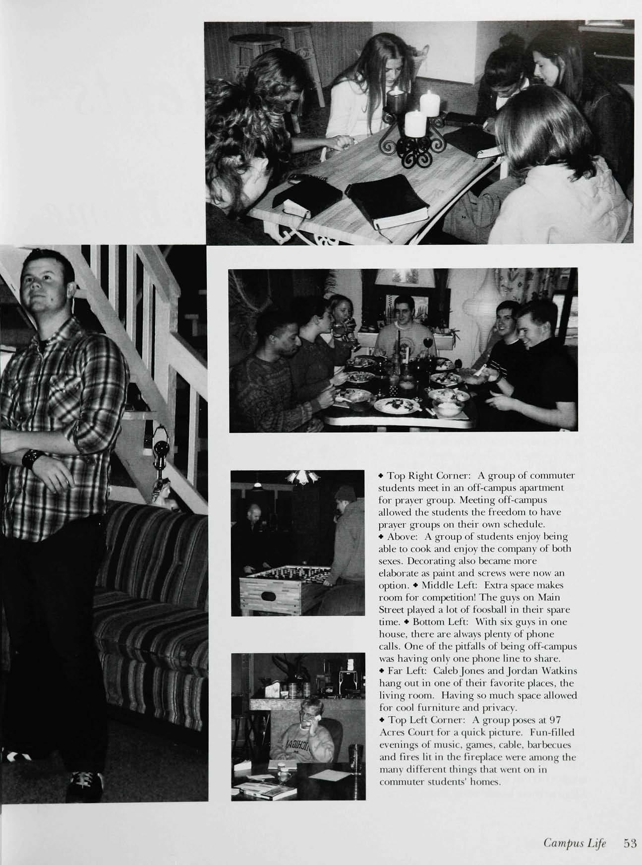 Somewhere between dorm life and graduation was the exciting world of off-campus living Late nightmovies, strange smells coming from the kitchen and the coveted purple commuter parking sticker, were only a part of what one got with hisor her monthly rent Jordan Watkins, a senior Exercise Science major, enjoyed hiscommuter status ina converted tire-showroom Six guys occupied thishuge downtown living space with its interesting layout and skylight."My canoe is hanging from the ceiling,"said Watkins, "andthat's only the beginning." While he loved the privacy and hisroommates, he admitted he missed "notbeing plugged into the socialpipeline that is 'The Marriott'." Junior CalebJones, a Worship major,shared his Mill Woods apartment with two roommates "I love the factthat my living room is twice the size of a dorm room." He said hisfavorite perks from livingoffcampus were "The Daily Show, my George Foreman Grilland never having to wear shower shoes!" Living offcampus came with a new sense of responsibility,with some students learning the true essence of smart spending. When asked what he spent his lastfivebucks on, Jones quickly replied, "Lender's Bagels,a pack of hot dogs, and Ramen noodles."