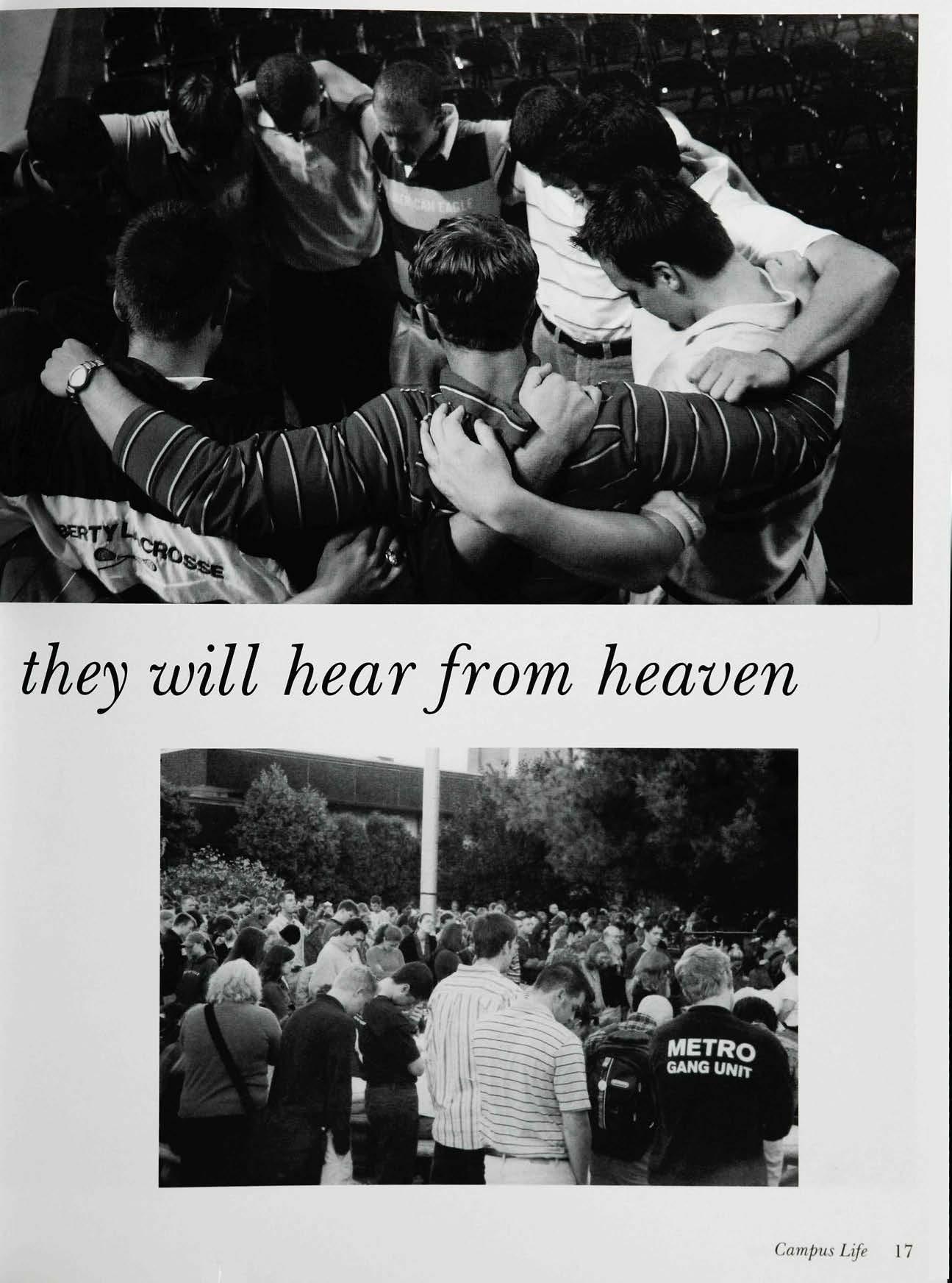 One of the fundamentals of our faith is prayer. Liberty was builtout of a vision,unwavering faith and fervent prayer That freedom of expression remains a lifeline of this campus today. Students have the opportunity tojoin together through weekly prayer groups, See You atthe Pole, and the biannual allnight of prayer. Organized prayer meetings are not always necessary At any given moment a student can feel the freedom to cry out to God inprayer; a group of believers can be seen stopping their normal routines to agree inprayer on behalf of another. The need each student carries can sometimes be an enormous burden, but seeking the face of God can always bring an answer toprayer.