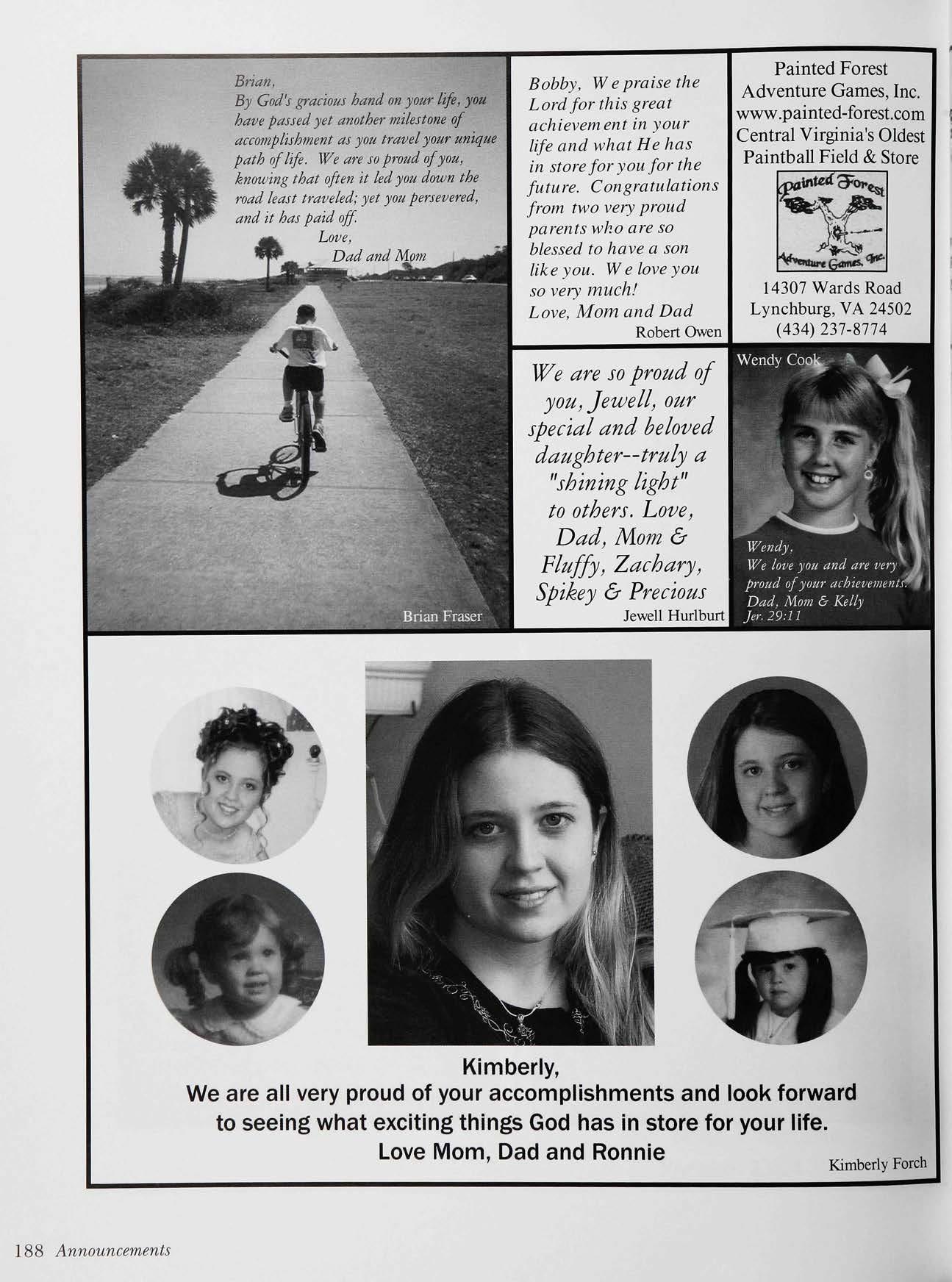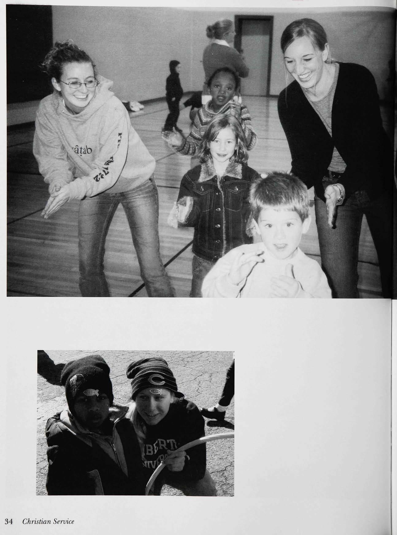 In Matthew 28:18-20, God gave every Christian a mission to spread the gospel of Christ to every person and every place Through Christian Community Service,students were able to fulfill that mission The CSER program is required for allstudents,but the experiences proved to be much more than a credit;they were a blessing. The mission outlined for students by the Christian Community Service Office is to affirm the Christian worldview and provide a practical expression of God's love for mankind. Students could be seen working allthroughout the central Virginia area Liberty University Christian Service workers were seen inlocal churches as youth pastors,Sunday school teachers,counselors and tutors. In the community, students were found serving as domestic violence counselors,working with Habitat for Humanity or atthe localboys'and girls' homes. Whether serving on a ministry team traveling up and down the eastcoast or babysitting children, students realized the privilege of giving of themselves for another. Regardless of what position students served in,they found they were impacting liveswith the message of Christ by putting hands and feet to the Gospel.