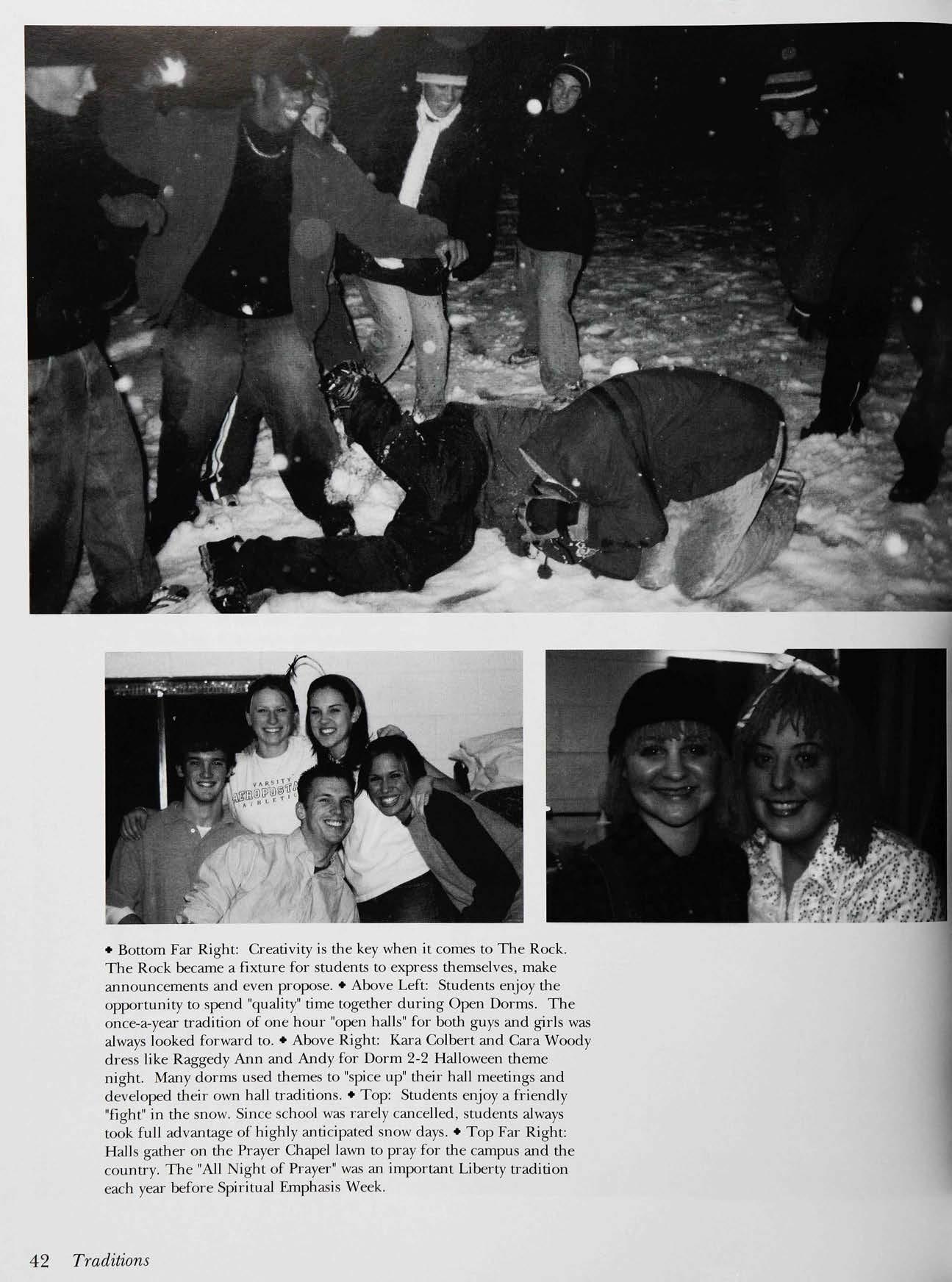• Bottom Far Right: Creativity is the key whe n it comes to Th e Rock Th e Roc k became afixturefor students to express themselves, mak e announcements and even propose. * Abov e Left: Students enjoy the opportunity to spend "quality" time together during Ope n Dorms Th e once-a-year tradition of one hour "open halls" for both guys and girls was always looked forward to. + Abov e Right: Kara Colbert and Cara Wood y dress like Raggedy An n and And y for Dor m 2-2 Halloween theme night Man y dorm s used themes to "spice up" their hall meetings and developed their ow n hall traditions. * Top : Students enjoy a friendly "fight" in the snow Since school was rarely cancelled, students always took full advantage of highly anticipated snow days * To p Far Right: Halls gather on the Prayer Chapel lawn to pray for the campus and the country Th e "All Night of Prayer" was an important Liberty tradition each year before Spiritual Emphasis Week