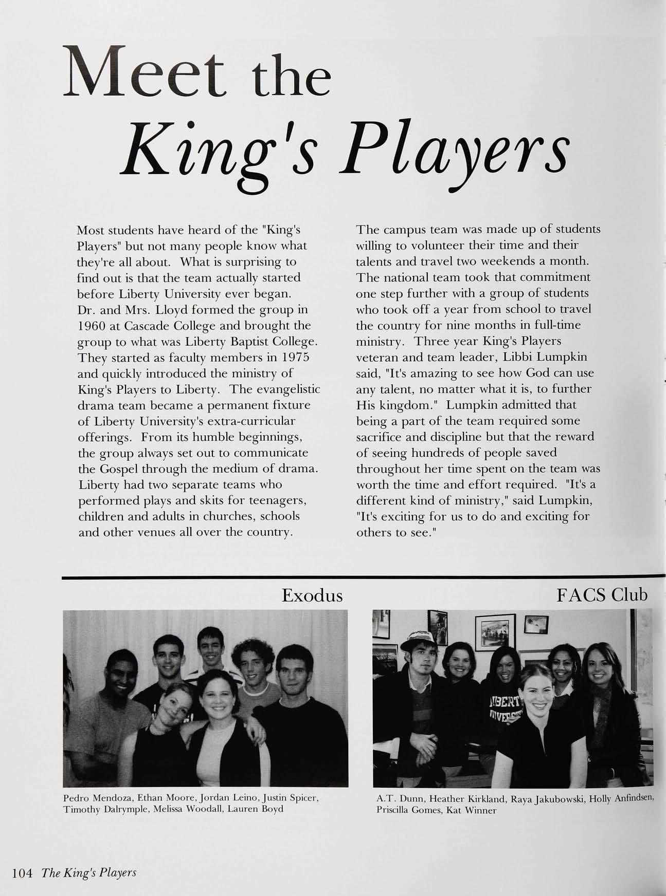 Every leader knows thatrewards do not come without sacrifice. Enter a typical day inthe lifeof a Liberty resident hall leader. Wake up, go to classes, accountability during lunch,more classes, "Dwayne meetings," RA group meetings, R A Forums, prayer groups, "Big Four," RHLM, and homework. When asked if they regret their position,they gave a resounding "no". Even with all the hard work there was occasionally time for fun. Leadership retreats,prayer group wars, and random scavenger hunts were activitiesmeant for team building but also provided a muchneeded outlet "The biggest reward of being in a leadership position,"said SLD Rachel Kolb, "is being able to see your hard work pay offas you watch the people you minister to grow to become more like Christ." Student leadership continues to be a catalystfor spiritual growth among students. When all is said and done,the impact of one prayer could change eternity. Liberty's spiritualheritage makes it distinct; that is why student leaders accepted their hectic schedules with pride and humility.