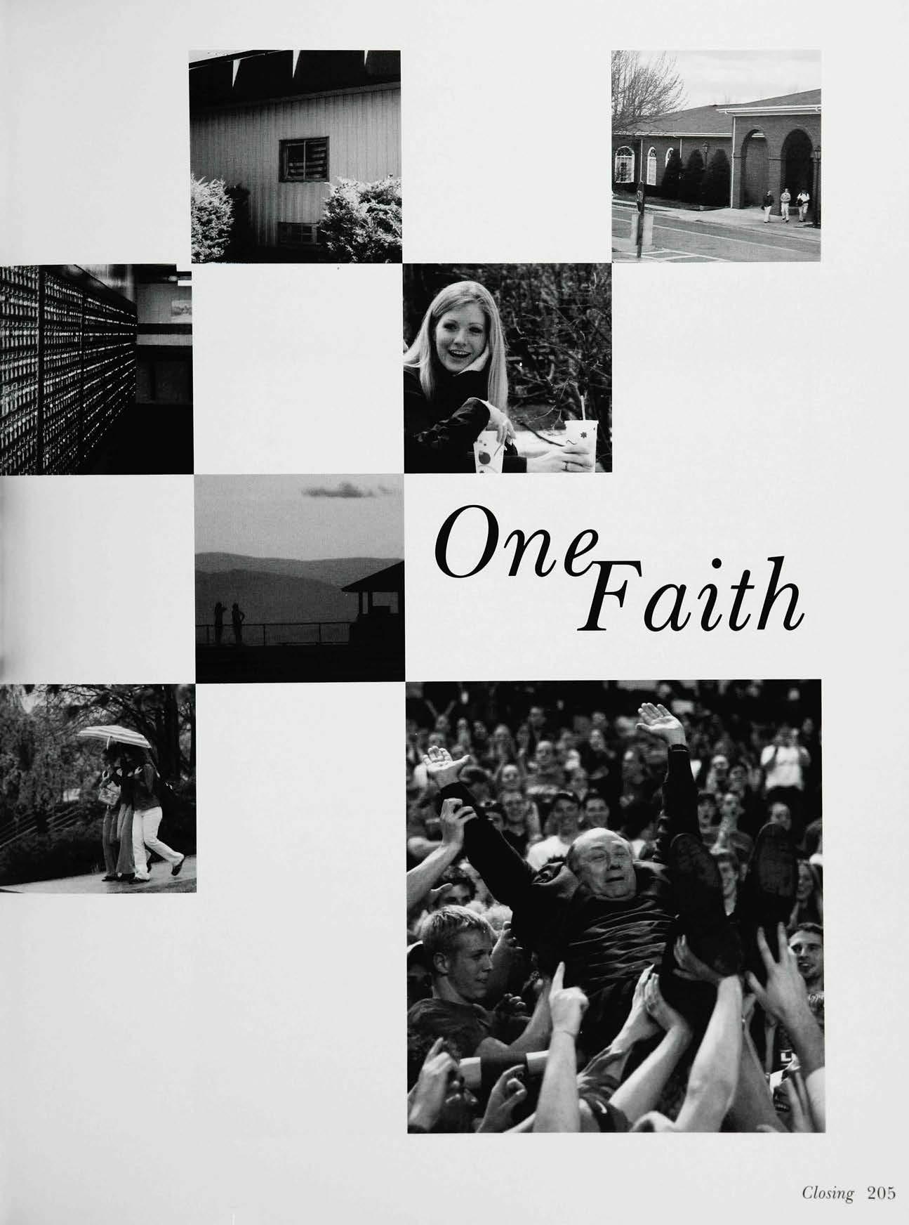 The music's pumping, so loud it drowns out the events of the day A gathering of friends makes the everyday ritualof dining on campus asocial occasion. Thursday night's hallmeeting turns precious study time into a chance to cross pathswi| people you haven't seen since last week. From roommates toclassmates,spirituality and academics; people,events and circumstances work together to shape our lives.+ Outside of church services, convocation and prayer groups, the central theme our livesis our faith. From the Block Party tothe Homecoming Parade,to Spiritual Emphasis Week and Super Conference, the faith each one ofus possesses is interwoven into the daily aspects of life. Individually,we possess the Spiritof the Lord ^ogether,we possess ON E Spirit, joining us togethd through our faith and our circumstances.