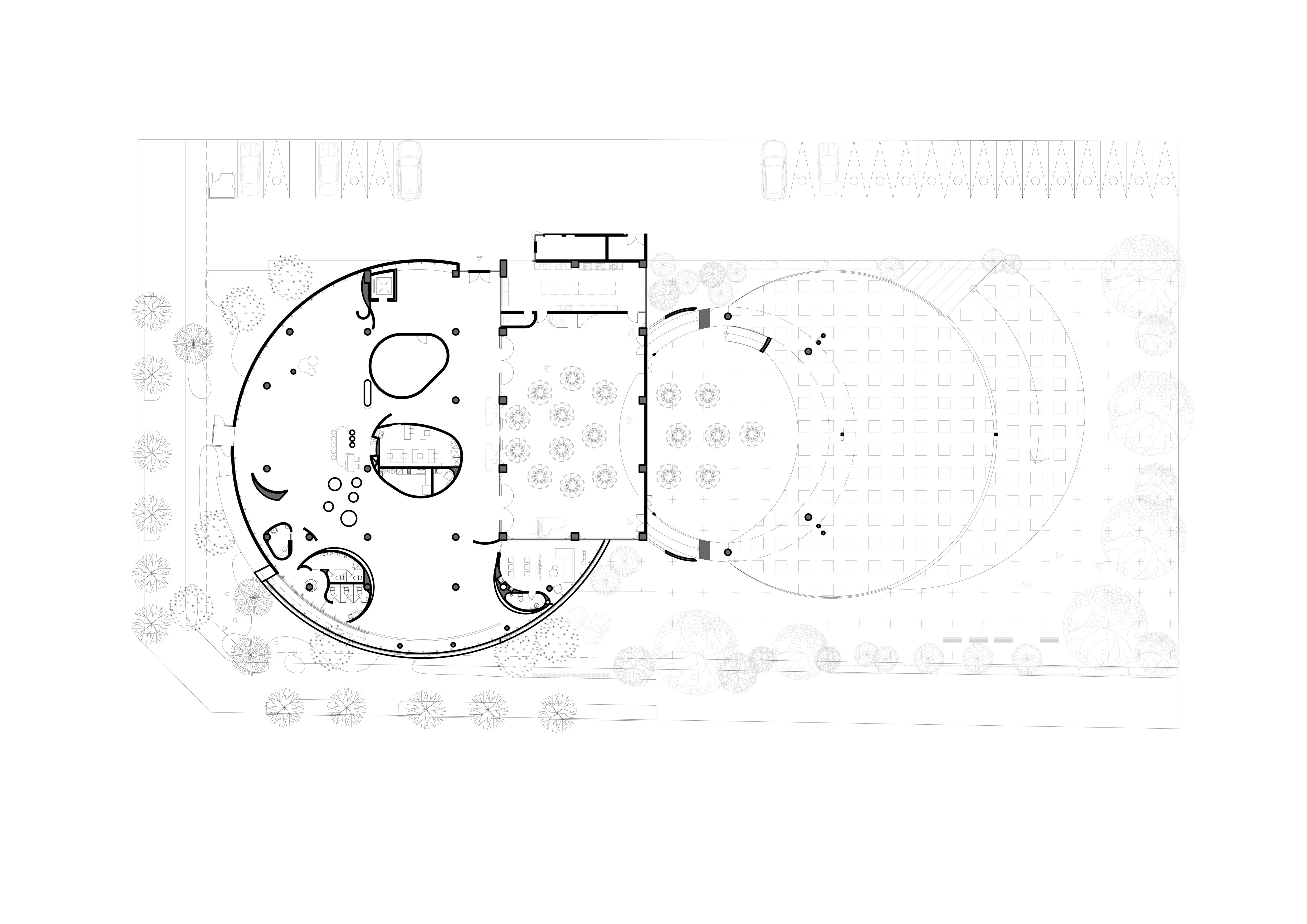 戶外庭院入口以竹籬(蓬門意象)作為和人行道的介面,一側種植竹子隨其自然生長,小徑跟 隨基地走向,一路走過開有各種向度洞口的牆體,可以一窺庭院景象,走進庭院中心是一處被 三面牆體圍朔的空間,行成一個較為私密,可供人們喝茶聊天的場所,四周開有洞口的牆體讓 喝茶的人們能夠招呼走道的人們一同共飲。