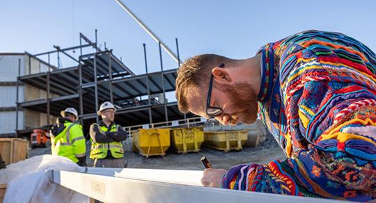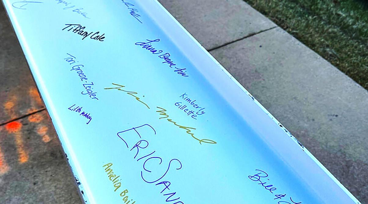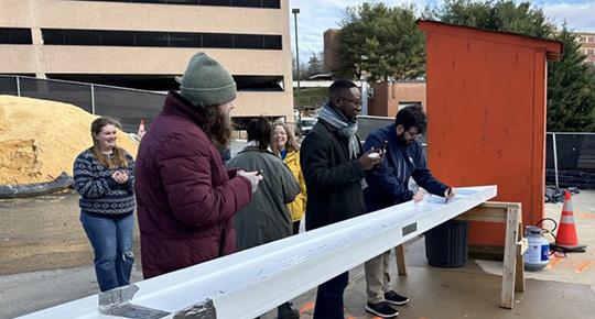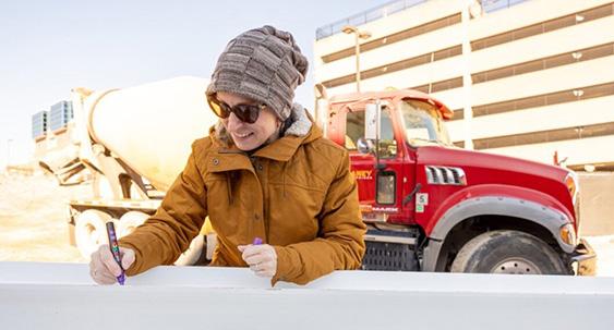 Eventually though, the future building begins to reveal itself. For Carrier Library, that emergence began in late 2023 when the structural steel that would become the skeleton of the expansion started to go up. Thanks to the thoughtful effort and careful planning of our construction partners, Libraries and Furious Flower Poetry Center employees had the opportunity to sign their names on the final beam along with the construction team. On January 10, 2024, the signed beam was lifted and placed on the north-west corner of the roof. The special beam will not be visible to the public when the building is complete, but the names of those who signed will be part of the building forever.