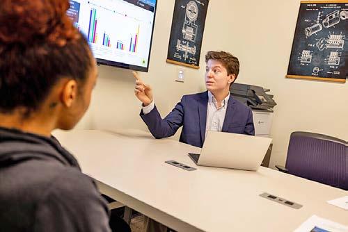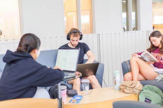 holographic displays, AI-powered design tools, and other cutting-edge innovations like haptic feedback systems and spatial computing. Flexible furnishings allow for various configurations, and student creations adorn the shelves. This space is designed for adaptability in its physical layout to support a variety of pedagogical approaches. When JMU instructors apply to teach in the Library Futures Classroom, they will be able to propose specialized software and technology that align with their curricular goals. JMU Libraries’ educational technology instructors and campus technology experts will collaborate closely with them to develop innovative, evidencebased learning experiences with those tools.