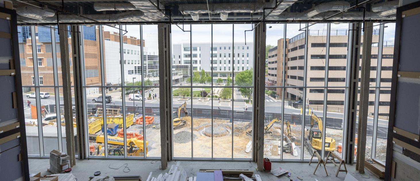View of the Library Futures Classroom’s interior window, which will look out onto a double-height space, with floor-to-ceiling windows, in the new wing of Carrier Library.
