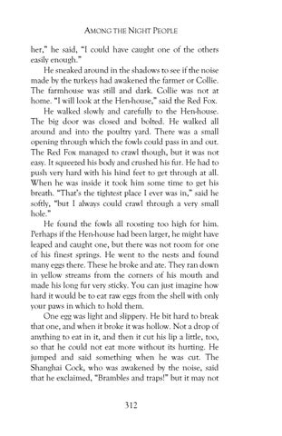 AMONG THE NIGHT PEOPLE her,” he said, “I could have caught one of the others easily enough.” He sneaked around in the shadows to see if the noise made by the turkeys had awakened the farmer or Collie. The farmhouse was still and dark. Collie was not at home. “I will look at the Hen-house,” said the Red Fox. He walked slowly and carefully to the Hen-house. The big door was closed and bolted. He walked all around and into the poultry yard. There was a small opening through which the fowls could pass in and out. The Red Fox managed to crawl though, but it was not easy. It squeezed his body and crushed his fur. He had to push very hard with his hind feet to get through at all. When he was inside it took him some time to get his breath. “That’s the tightest place I ever was in,” said he softly, “but I always could crawl through a very small hole.” He found the fowls all roosting too high for him. Perhaps if the Hen-house had been larger, he might have leaped and caught one, but there was not room for one of his finest springs. He went to the nests and found many eggs there. These he broke and ate. They ran down in yellow streams from the corners of his mouth and made his long fur very sticky. You can just imagine how hard it would be to eat raw eggs from the shell with only your paws in which to hold them. One egg was light and slippery. He bit hard to break that one, and when it broke it was hollow. Not a drop of anything to eat in it, and then it cut his lip a little, too, so that he could not eat more without its hurting. He jumped and said something when he was cut. The Shanghai Cock, who was awakened by the noise, said that he exclaimed, “Brambles and traps!” but it may not 312